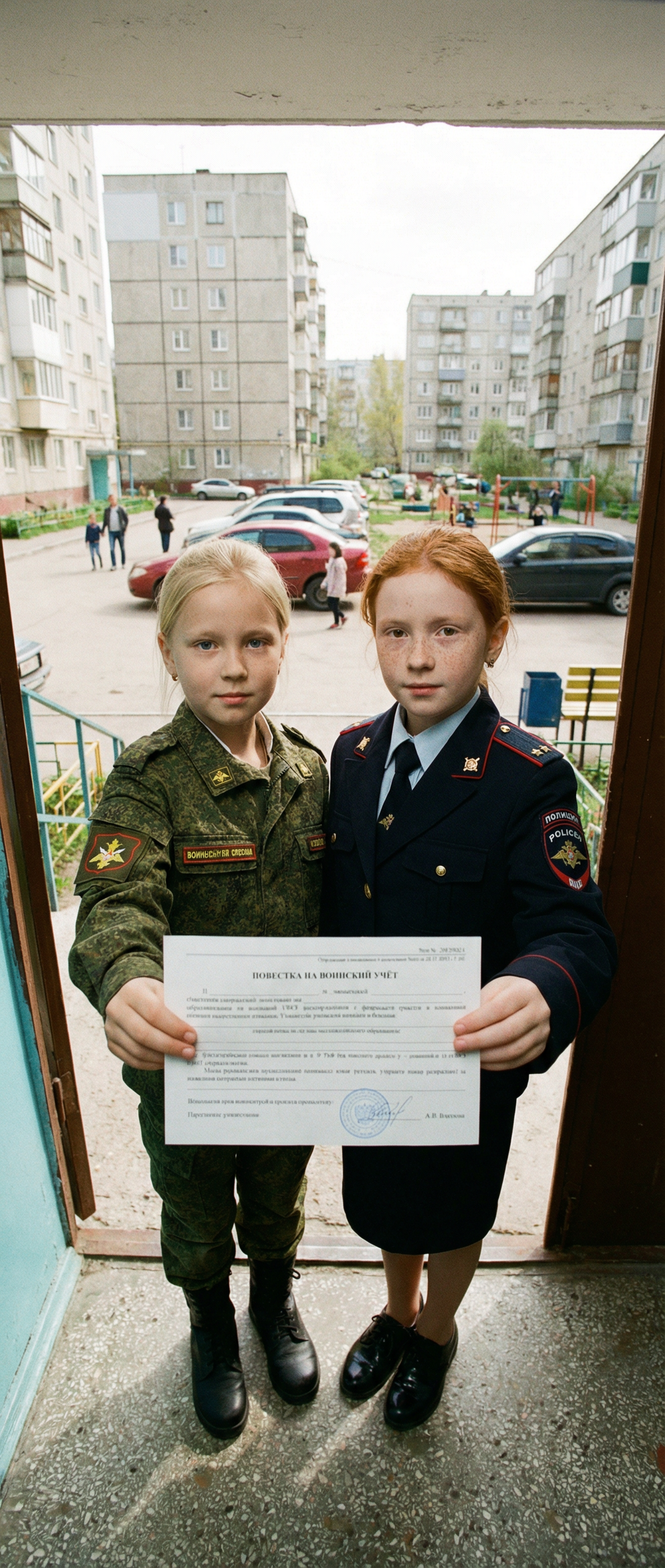 Соотношение сторон 9:21, слегка солнечный полдень, вид снизу со входа из подъезда, эффект приближенного широкоугольного фото, две десятилетние русские белокурая и рыжая девочки стоят в военной и полицейской формах и берцах и туфлях в полный рост очень близко на переднем крупном плане и смотрят в камеру и протягивают из рук повестку на воинский учет, детальные лица, веснушки, на заднем плане российский двор