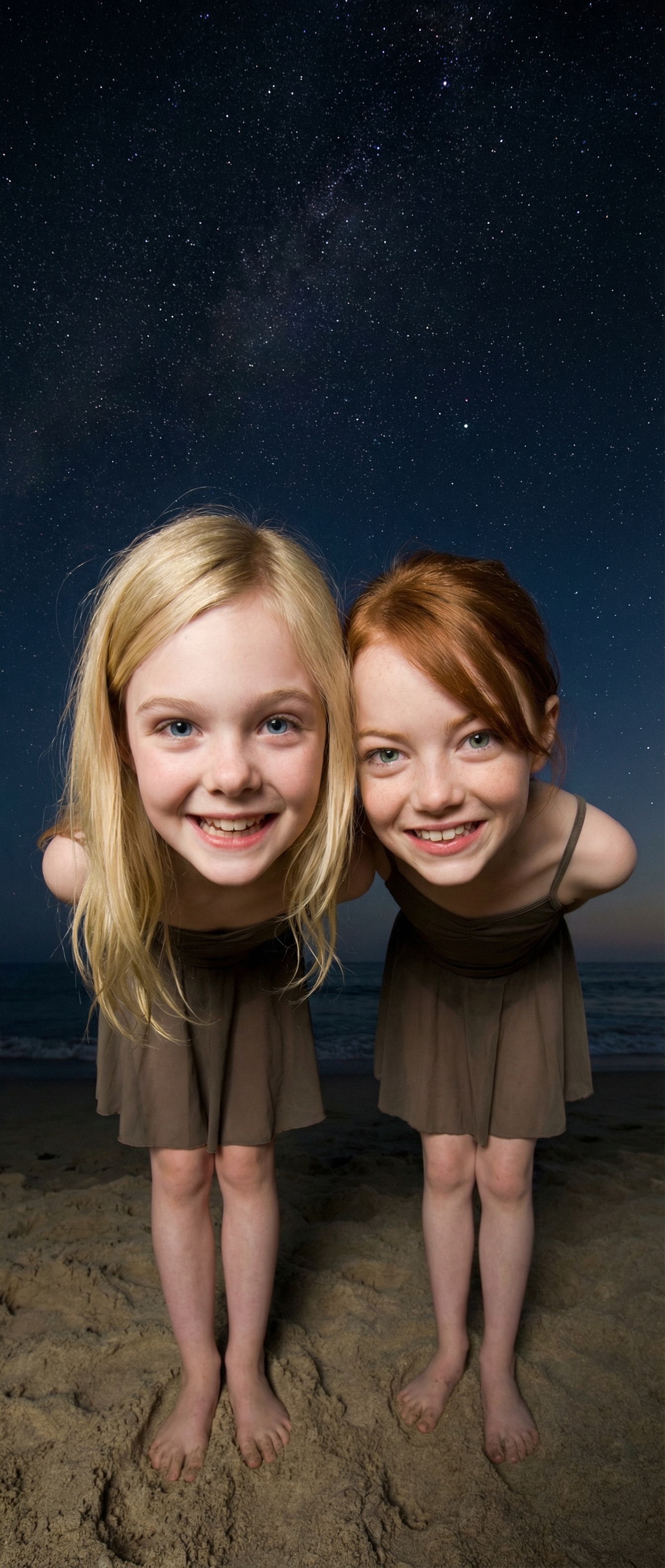 9:21 aspect ratio, only two person in frame, below close-up view from bottom sand, photography, summer night, wide-angle close-up distortion, full foreground from top to bottom close-up full body 8-year-olds blonde Elle Fanning with blue eyes and 8-year-olds redhead Emma Stone with green eyes, Elle Fanning face, Emma Stone face, both full standing and wearing dark-beige ballet dance clothes and smiling happily close-up looking at camera, long hair, freckles on arms and legs, bottom foreground close-up bare feet close-up bare feet, bottom background beach ocean, top and center background empty starry night sky empty starry night sky