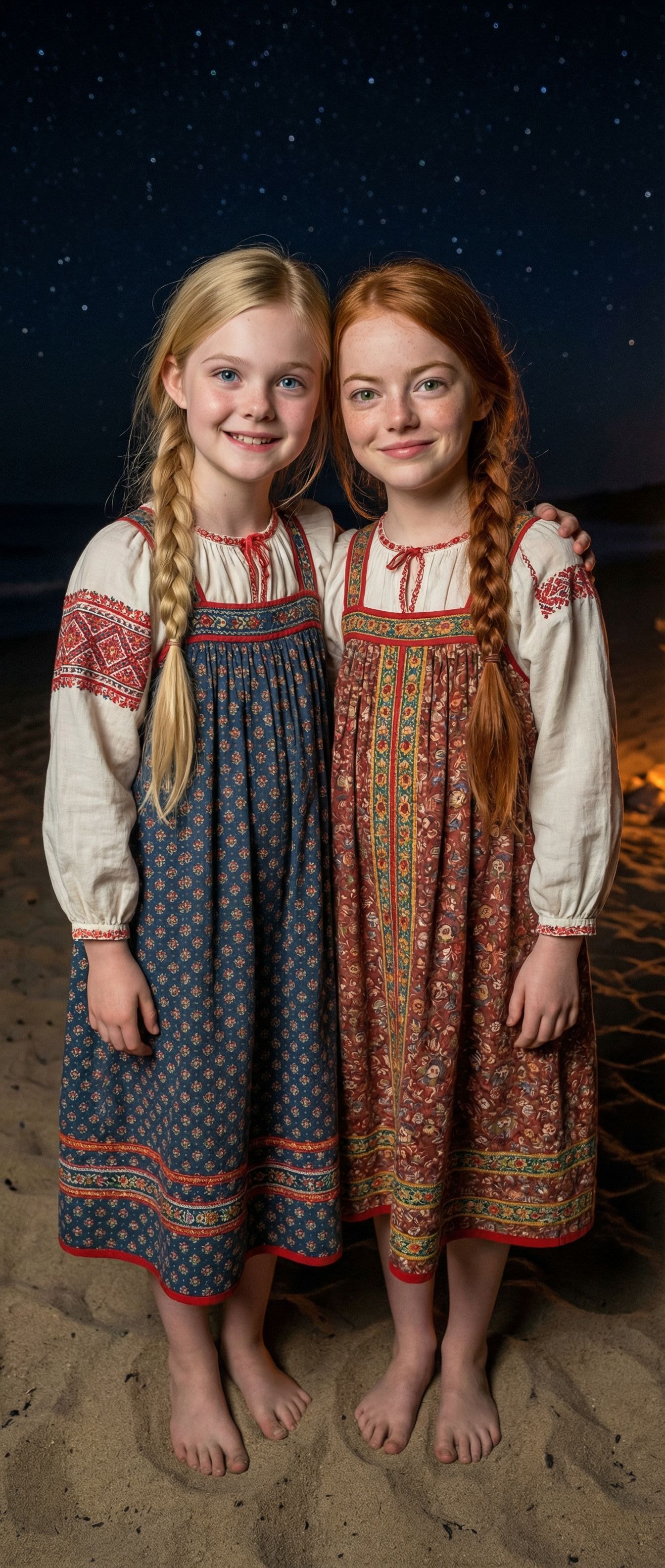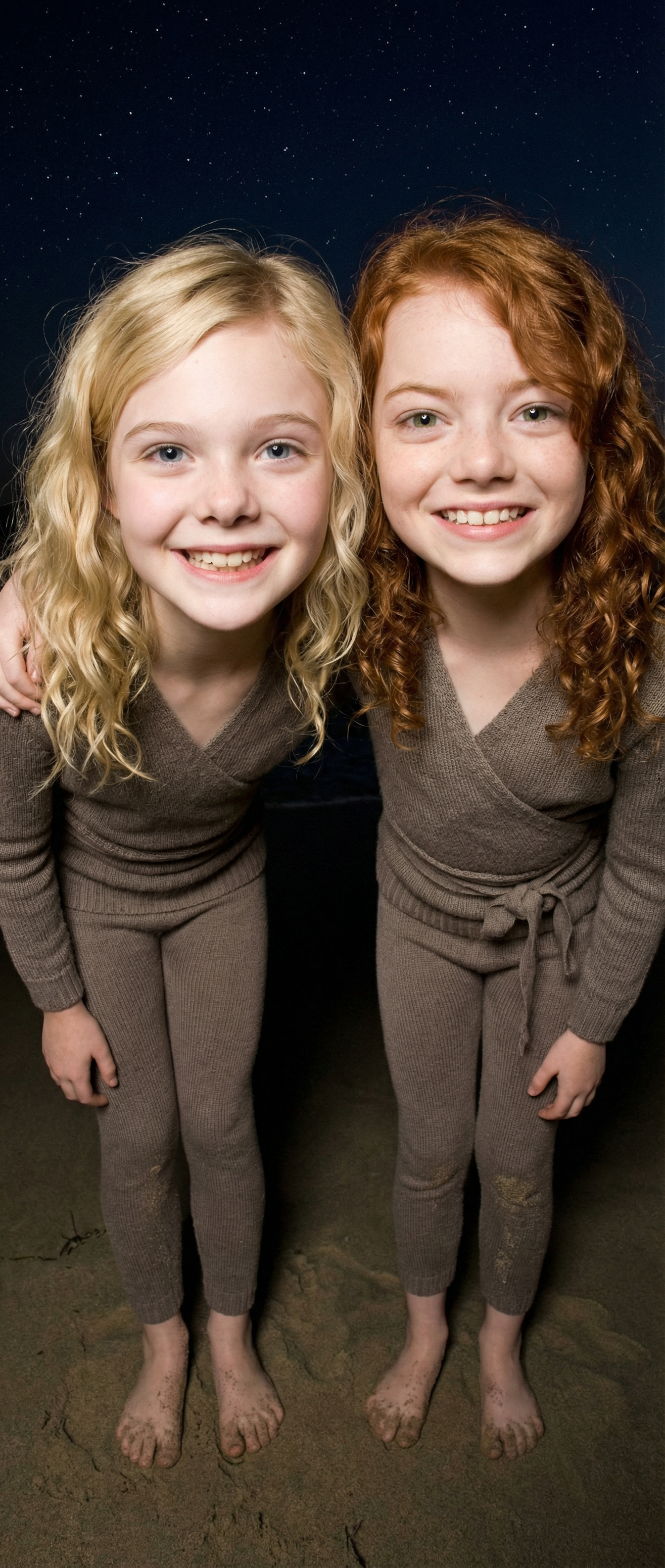 9:21 aspect ratio, wide-angle close-up detailed shot, close-up detailed full bodies filling full frame, close-up detailed 8-year-old blonde Elle Fanning with blue eyes and close-up detailed 8-year-old redhead Emma Stone with green eyes standing very close together, close-up detailed faces of Elle Fanning and Emma Stone, close-up detailed russian childish clothes, close-up detailed eyes, close-up detailed arms and legs, close-up detailed bare feet, close-up detailed long hair, close-up detailed smiling happily looking at camera, beach night starry sky in background