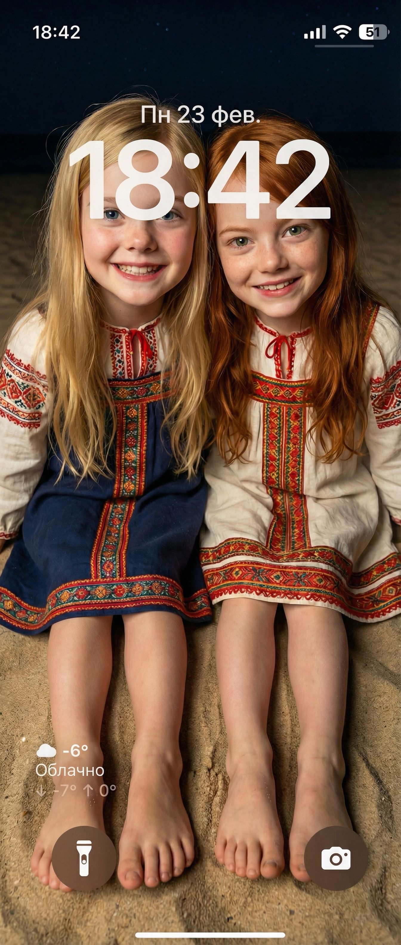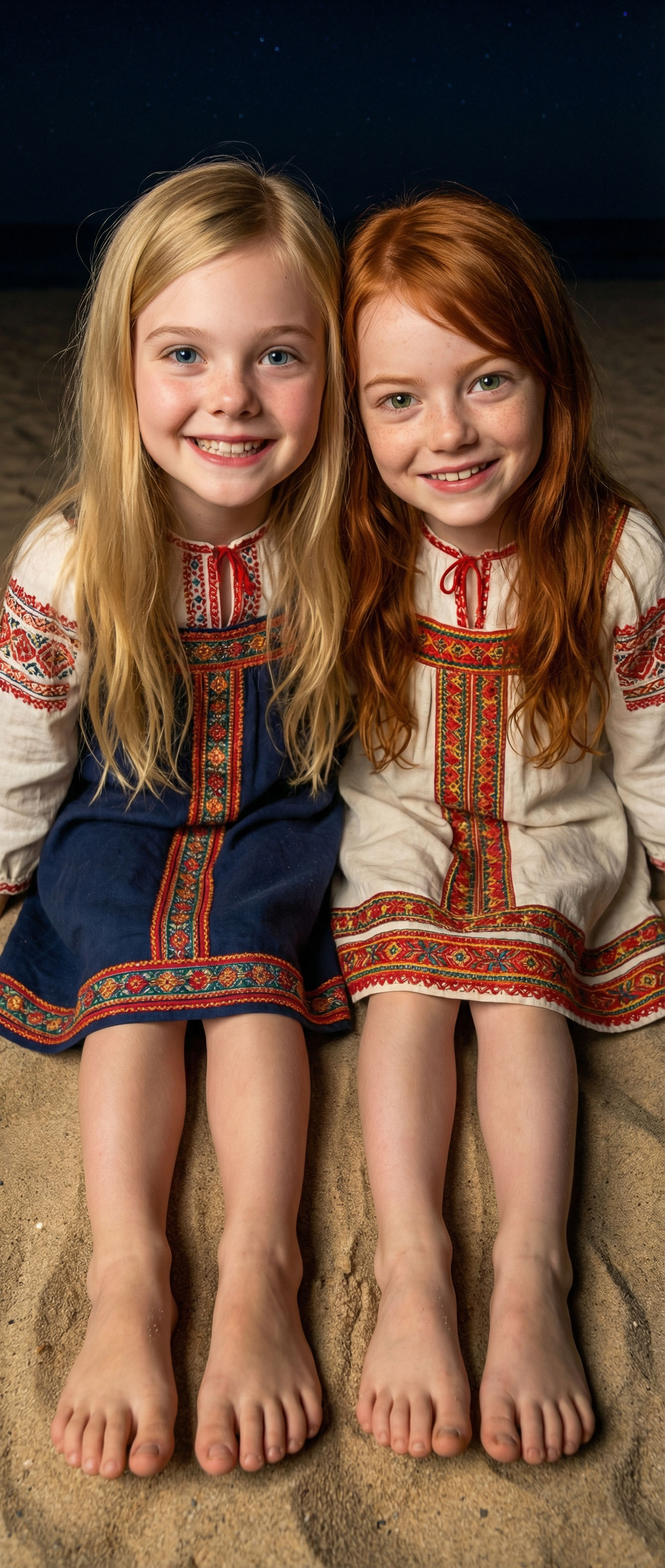 9:21 aspect ratio, below view from sand, wide-angle focused photo, close-up focused foreground 8-year-old blonde Elle Fanning with blue eyes and 8-year-old redhead Emma Stone with green eyes sitting with their legs stretched out on the sand very close together, full foreground focused detailed faces of Elle Fanning and Emma Stone smiling happily, focused foreground bare feet, no arms, hatless long hair, russian childish clothes, blurred bottom background empty beach night starry sky