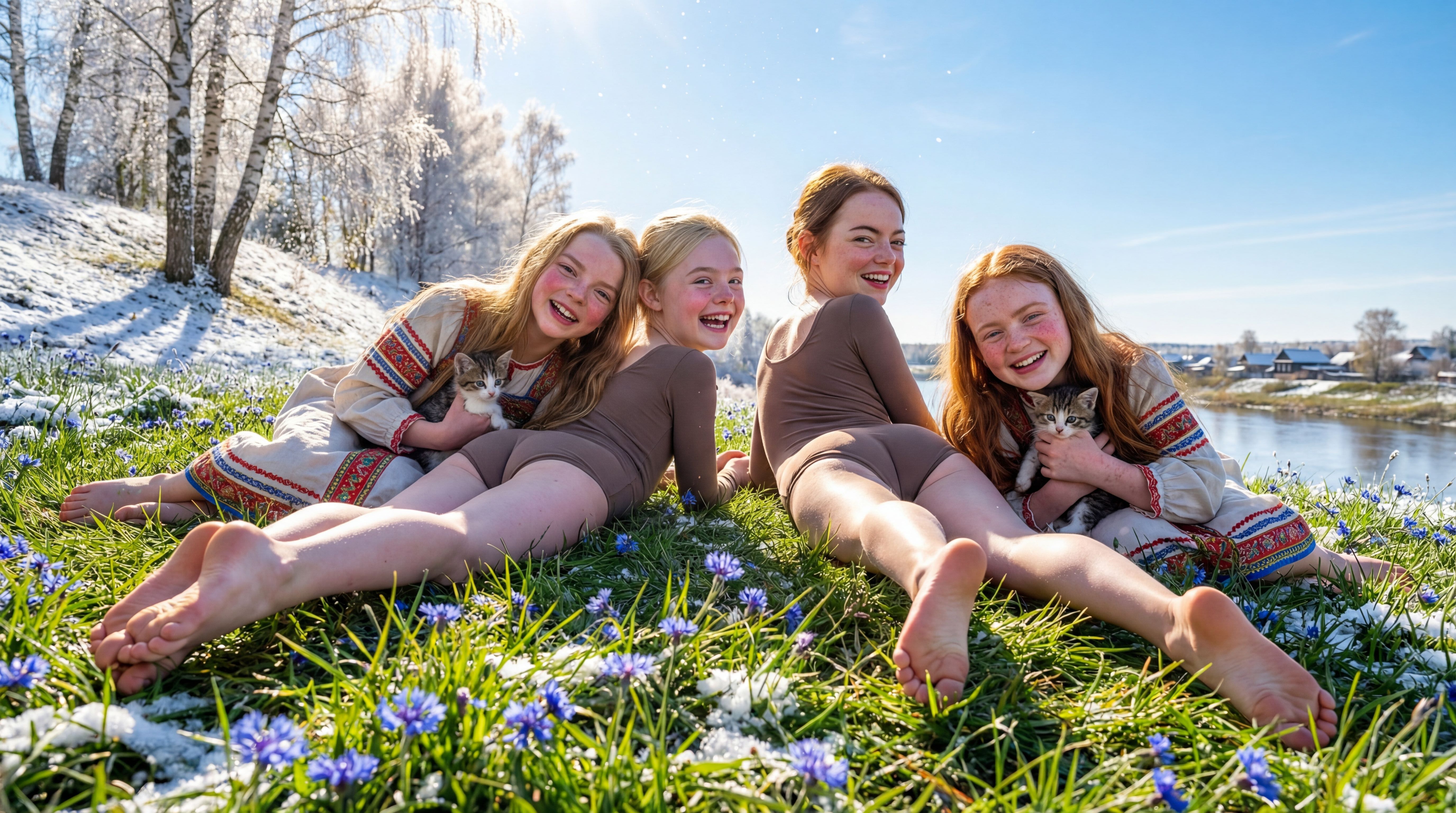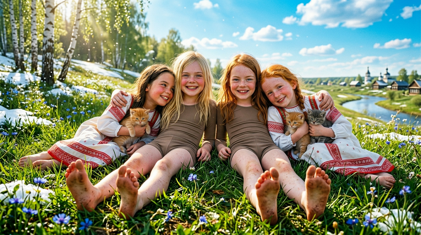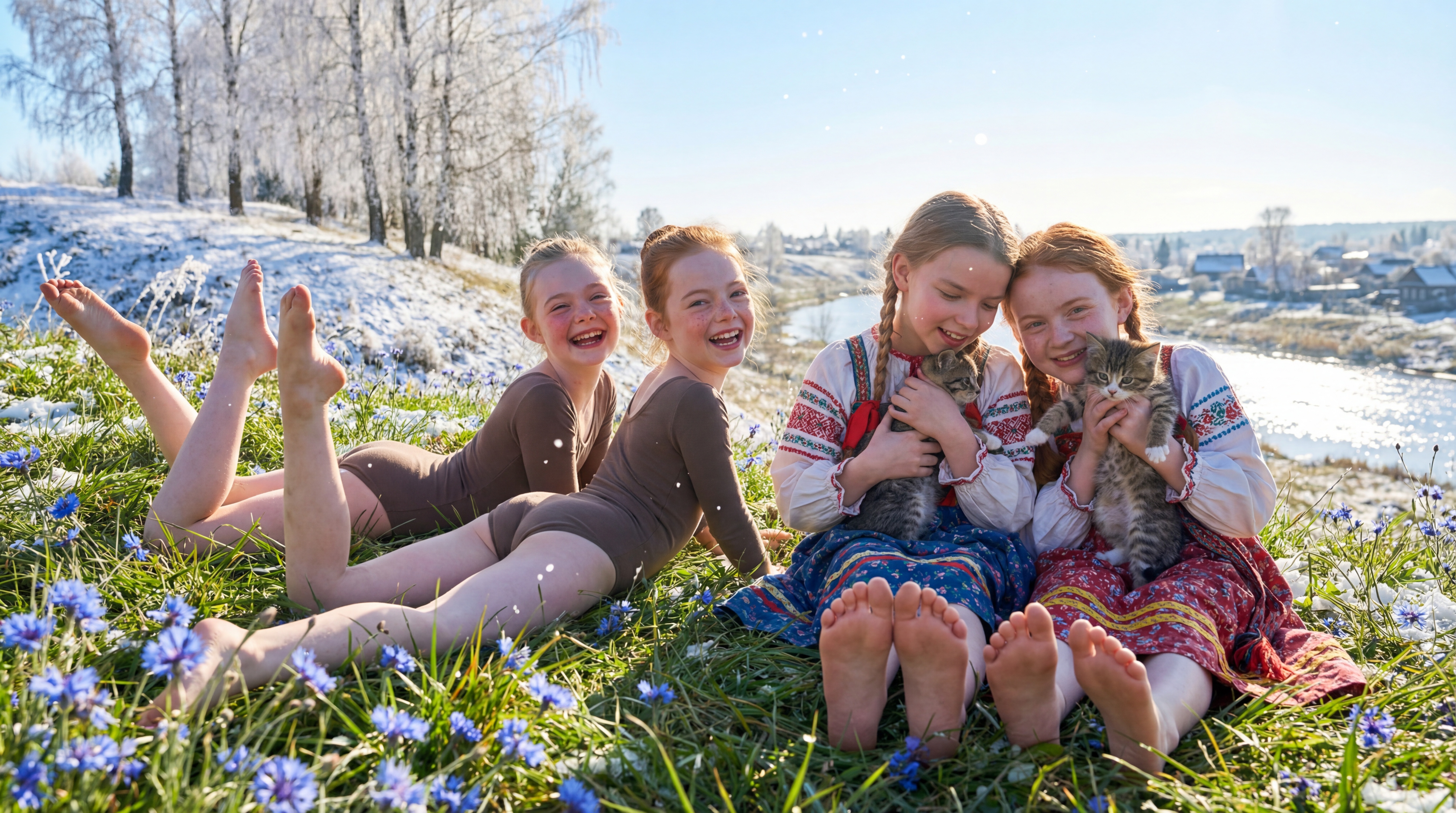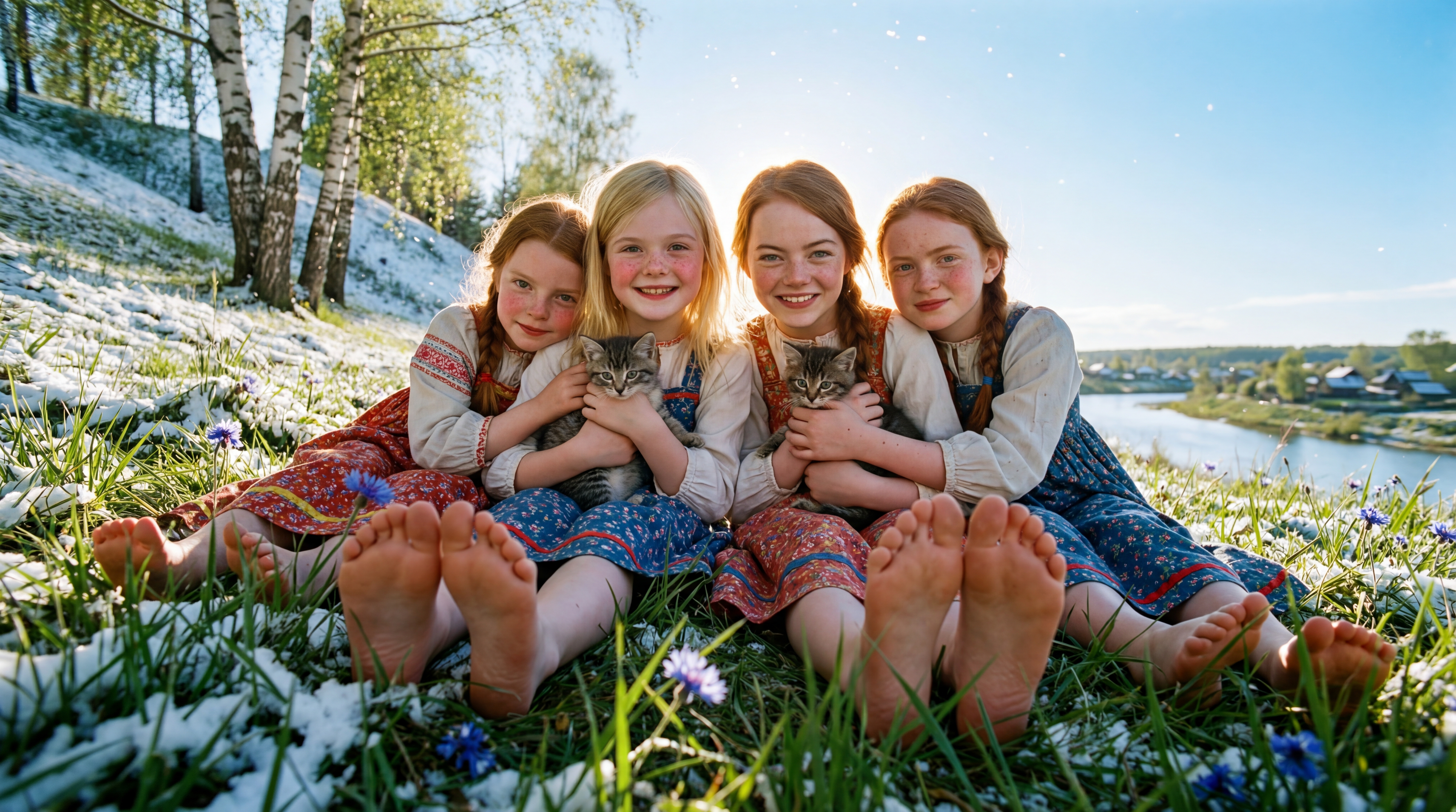 Соотношение сторон, гиперреализм, счастье, добрые эмоции, насыщенность цветов, вся фокусировка на людях, вид снизу от весенней травы, настоящая реалистичная фотография, свет светит на людей освещая их тела полностью спереди и создавая по сторонам небольшие частицы света, на переднем приближенном крупном плане в центре 8-year-old Elle Fanning и 8-year-old Emma Stone в темно-бежевой одежде для гимнастики лежат на животах спинами к камере горизонтально вытянув приближенные ноги на небольшом опускающимся холме покрытым ярко зелёной свежей травой и синими васильками слегка покрытыми снегом в полный рост и приподнимая и растягивая ноги в стороны и смотрят в камеру повернув головы и их ступни ног на переднем плане и приближенные 8-year-old Anya Taylor-Joy и 8-year-old Sadie Sink в русской национальной детской летней одежде держат в руках котят и лежат рядом по бокам слегка нагнувшись и при обнимая их, румянец на лицах, веснушки на руках и ногах, веснушки на лицах, длинные распущенные волосы без головных уборов, детальные глаза, на переднем крупном приближенном плане ступни ног без обуви, яркая весна, на заднем плане слева возвышенный холм покрытый весенним лёгким снегом и на нем слева берёзы покрытые инеем сквозь которые просвечивает солнце и ярко-сине-голубое небо и вдали справа река и русская деревня