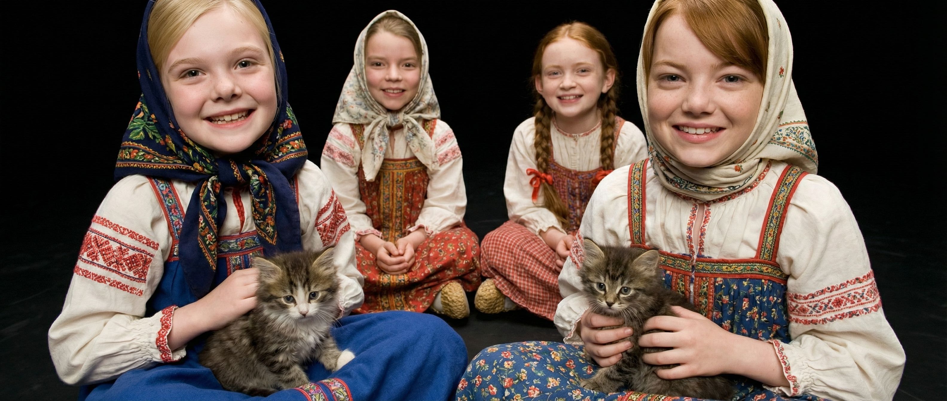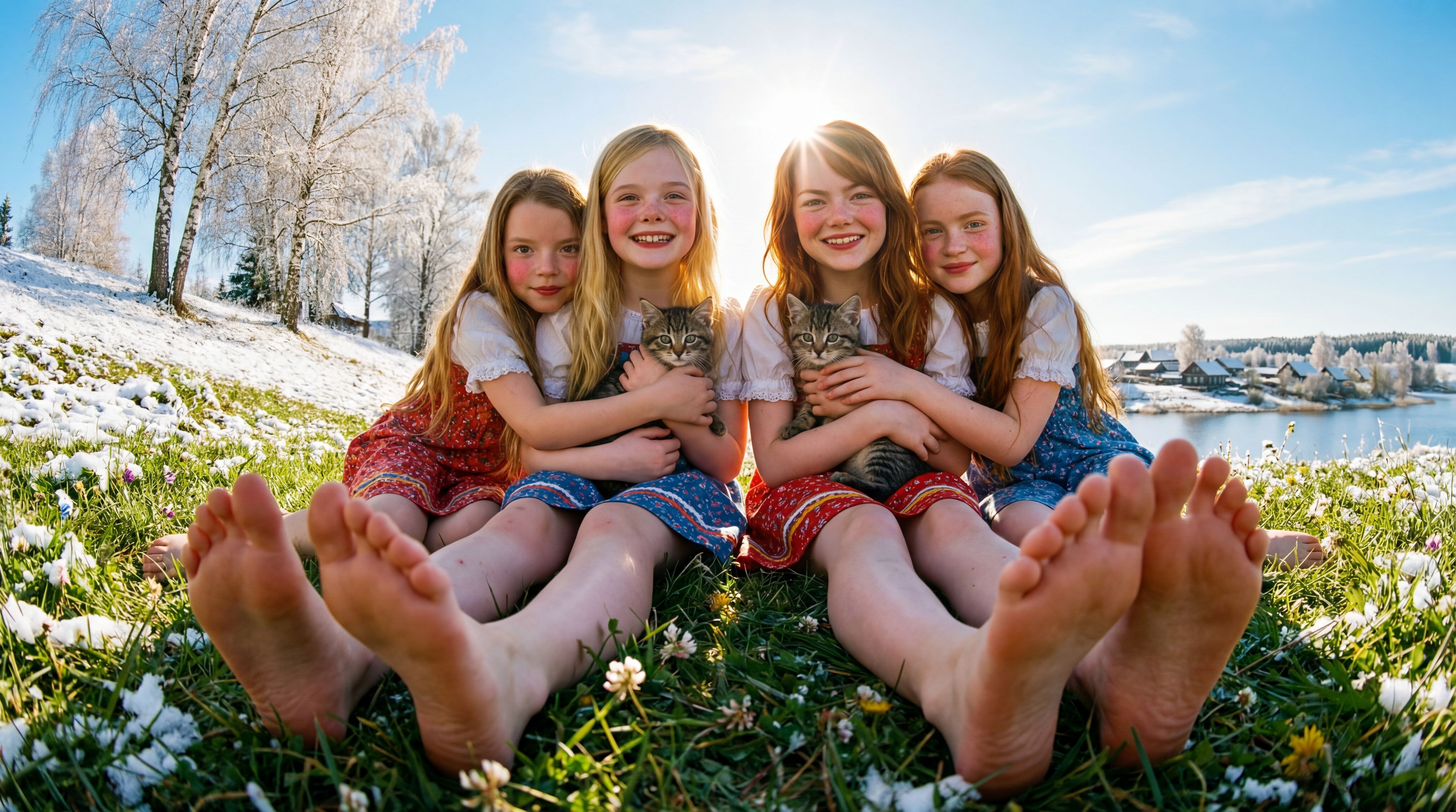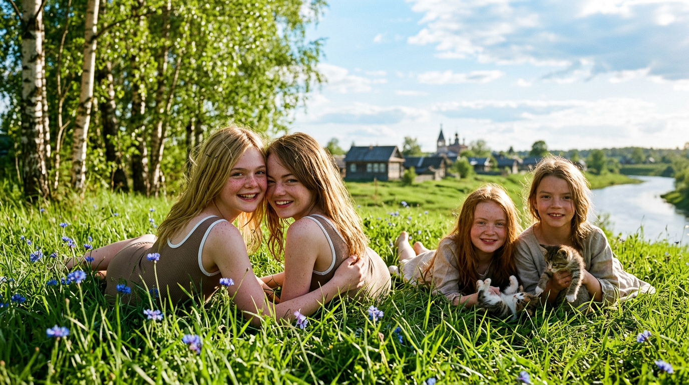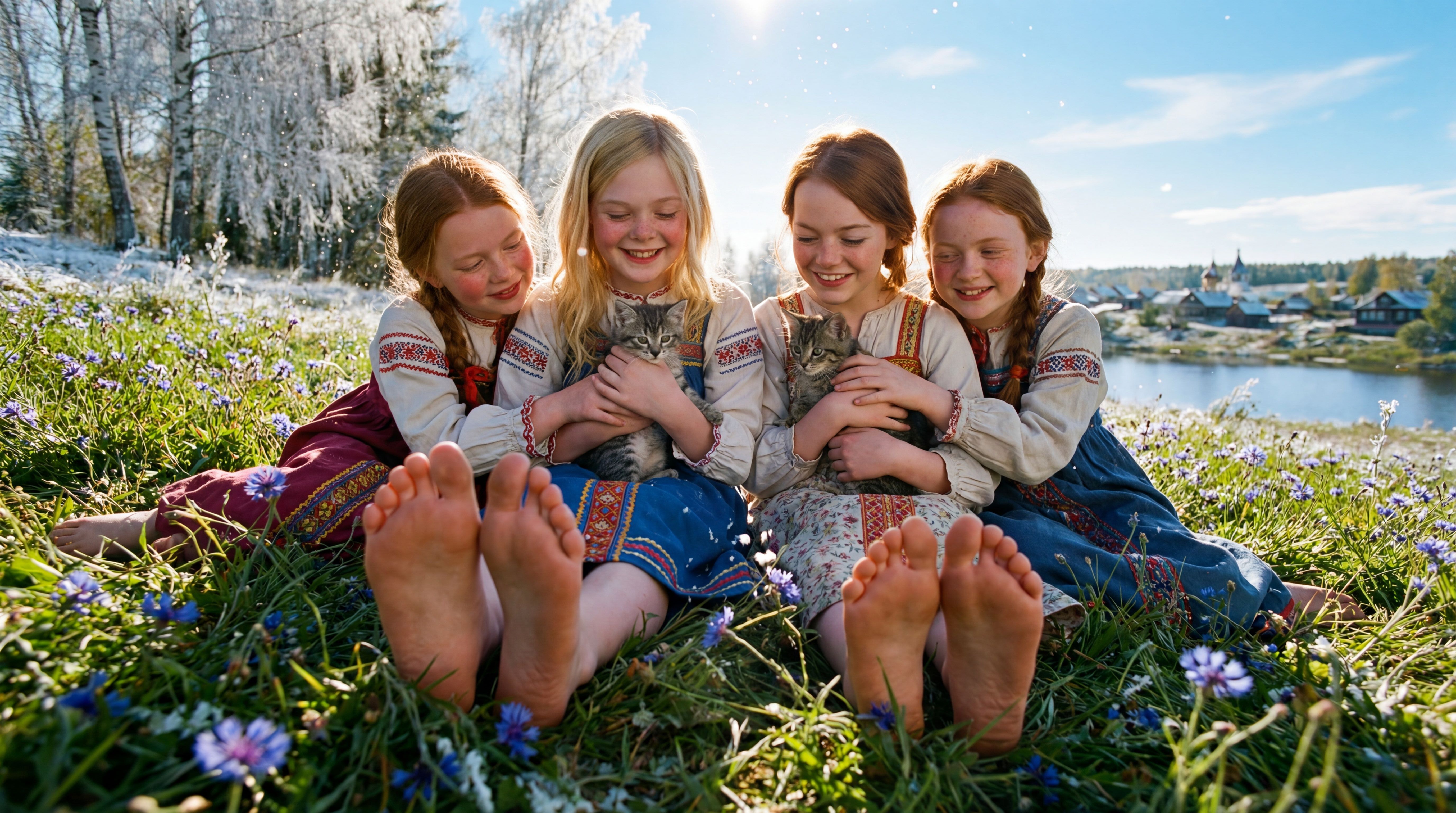 Соотношение сторон, гиперреализм, счастье, добрые эмоции, насыщенность цветов, вся фокусировка на людях, вид снизу от весенней травы, настоящая реалистичная фотография, свет светит на людей освещая их тела полностью спереди и создавая по сторонам небольшие частицы света, на переднем приближенном крупном плане в центре 8-year-old Elle Fanning и 8-year-old Emma Stone в темно-бежевой одежде для гимнастики лежат на животах спинами к камере горизонтально вытянув приближенные ноги на небольшом опускающимся холме покрытым ярко зелёной свежей травой и синими васильками слегка покрытыми снегом в полный рост и приподнимая и растягивая ноги в стороны и смотрят в камеру повернув головы и их ступни ног на переднем плане и приближенные 8-year-old Anya Taylor-Joy и 8-year-old Sadie Sink в русской национальной детской летней одежде держат в руках котят и лежат рядом по бокам слегка нагнувшись и при обнимая их, румянец на лицах, веснушки на руках и ногах, веснушки на лицах, длинные распущенные волосы без головных уборов, детальные глаза, на переднем крупном приближенном плане ступни ног без обуви, яркая весна, на заднем плане слева возвышенный холм покрытый весенним лёгким снегом и на нем слева берёзы покрытые инеем сквозь которые просвечивает солнце и ярко-сине-голубое небо и вдали справа река и русская деревня