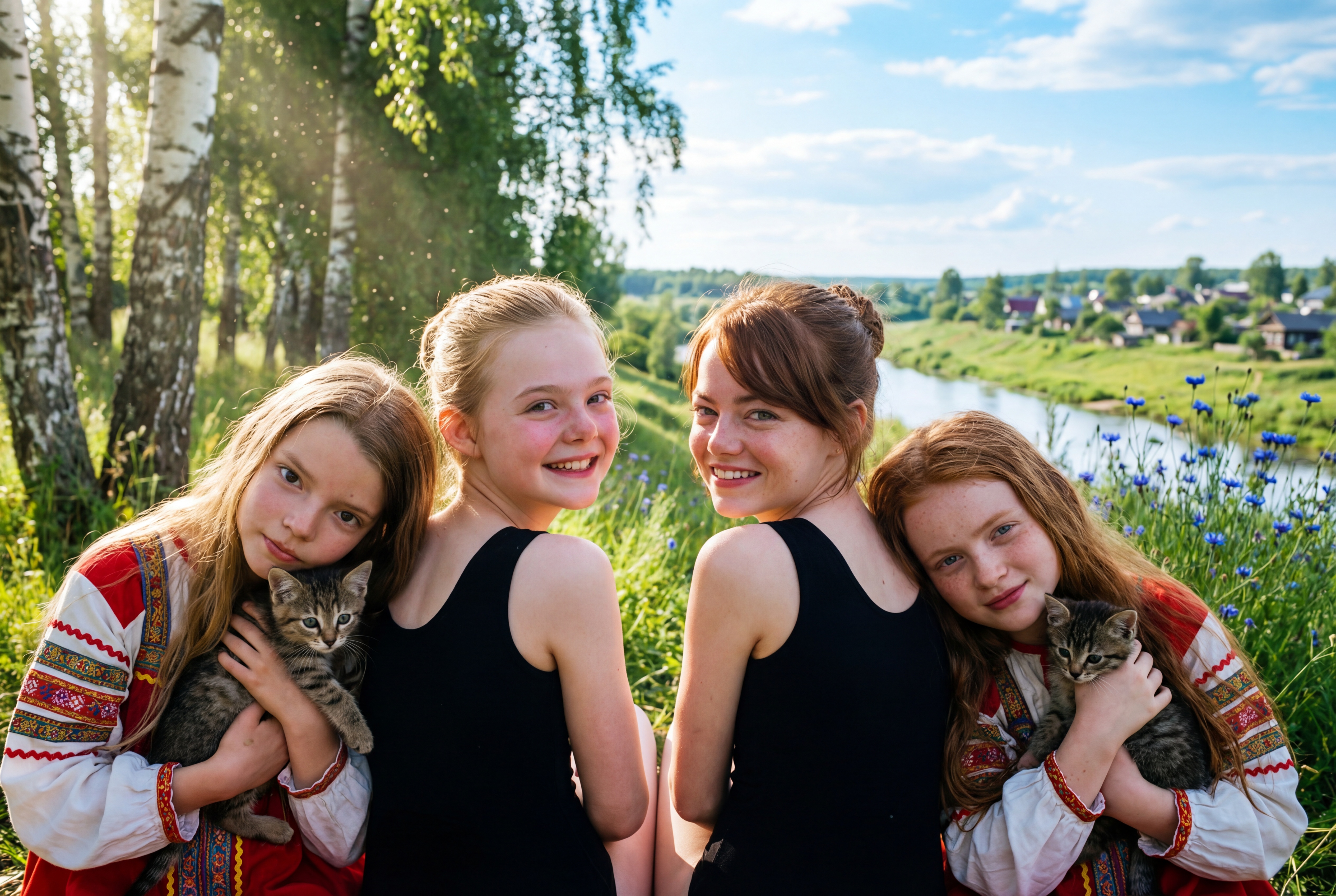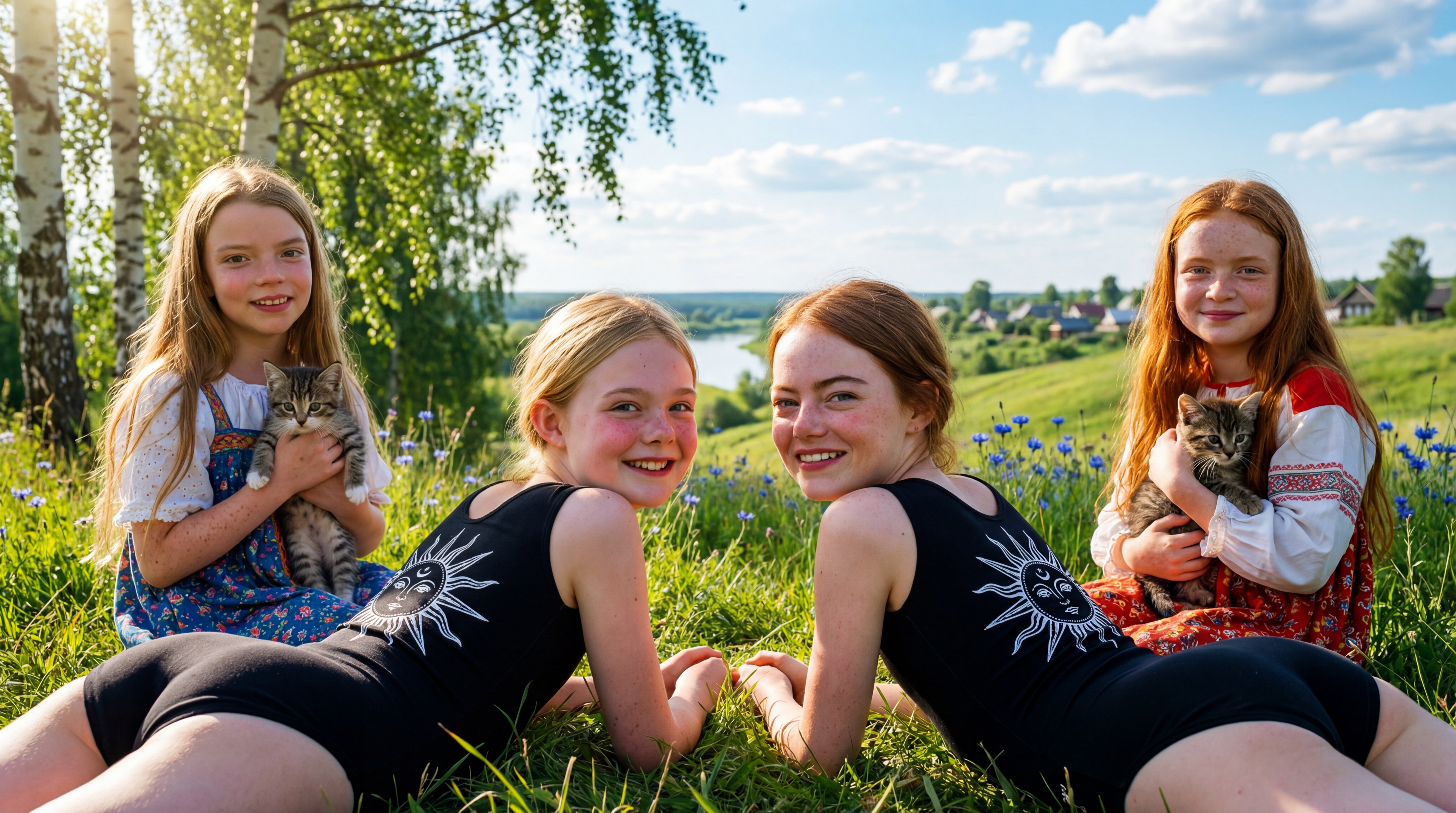 Соотношение сторон 16:9, hasselblad shot, гиперреализм, счастье, радость, вид от приближенных бедер находящихся в центре, насыщенность цветов, реалистичная настоящая фотография снятая на hasselblad canon, небольшие частицы света, шестилетние детские лица актрис, на переднем приближенном крупном плане в центре кадра бедра и спины лежащих 8-year-old Elle Fanning и 8-year-old Emma Stone в черной лёгкой одежде для гимнастики с безрукавниками с белым принтом на спине где нарисовано упрощенное германское эзотерическое оккультное черное солнце без текста и смотрят в камеру повернув головы, приближенные 8-year-old Anya Taylor-Joy и 8-year-old Sadie Sink в русской национальной детской летней одежде при обнимают в руках котят и лежат рядом по бокам слева и справа, румянец на лицах, веснушки на руках и плечах и спине, веснушки на лицах, длинные распущенные волосы без головных уборов, детальные глаза, яркая весна, на заднем плане опускающийся холм покрытый ярко зелёной свежей травой и синими васильками и слева приближенные берёзы сквозь которые просвечивает солнце и ярко-сине-голубое небо и облака и вдали справа снизу река и русская деревня