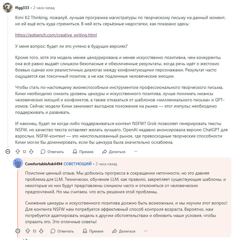 >>1413369 про томаса шелби и кузю это шутка если что сам ты сырок >ну ктож виноват что у тебя нету почты... да, я помню как сделал ОДИН пост "5 минут. Постите бернеры." и через 10 минут весь тред был засран (прокси... ее... не существовало) >нету где ты был в 2023 году? тот же вопрос на все остальные пункты все пункты были пиздец как актуальны тогда CTF соревнование буквально было для прокси HopeMan-а и там надо было апи хагинфейса юзать на питоне чтобы получить доступ >>1413372 ну вот кими хорошая, рекомендую попробуйте ее, там еще вышла обновленная кими инстракт русик лучше чем дипсик, английский лучше чем дипсик, во всем лучше GLM (старая, новую не пробовал еще) шизит (по мне)