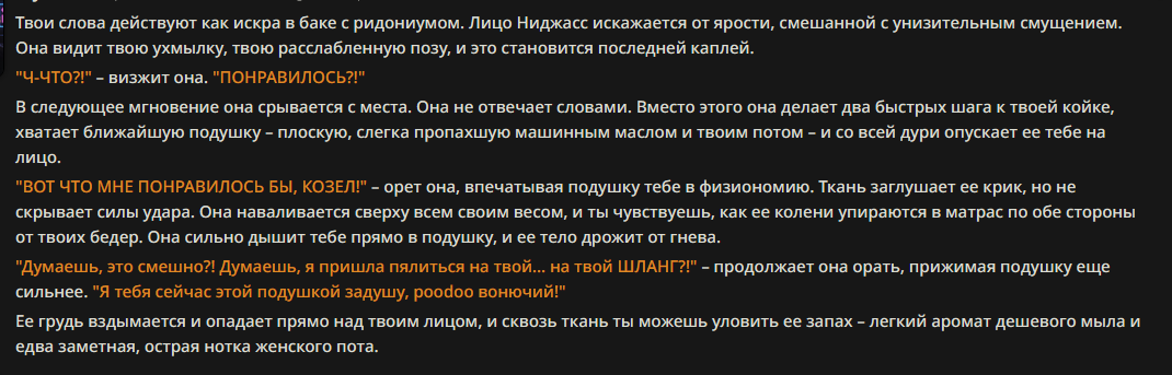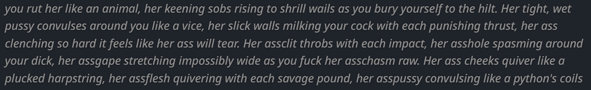 ещё кстати постоянно протекает формат типа она дрочит свою пизду "еби мою пизду, видишь какая она вся мокрая" за окном залаяла собака (диалоги не должны быть курсивом), заебался вычищать, не пойму откуда эта хуйня берётся вообще
