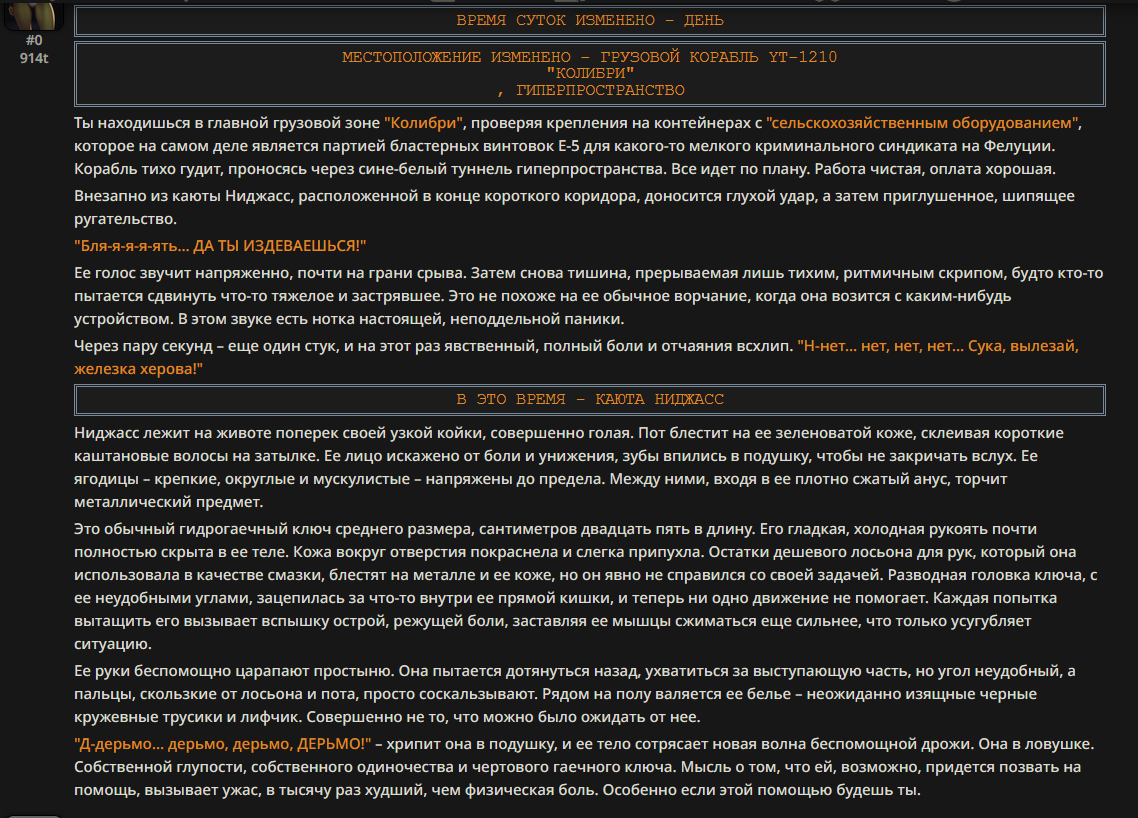 Гриты: 1. Играете с напарницей в сабакк на раздевание и после очередного раунда вы видите... (пикрил). 2. Нейтральный гритинг после одной из доставок, разберитесь с мелкой поломкой корабля и развлекайтесь в криминальном мире ЗВ.
