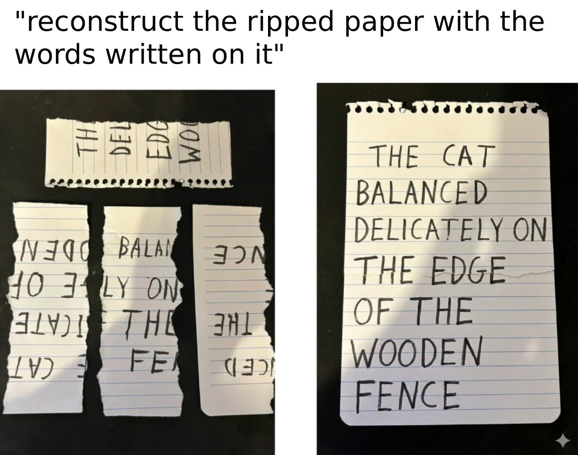 >>1413842 >3 пик Так это не правильно оно сделало. Вот я сделал, как оно должно было быть. Оно, получается, просто прочитало текст с листочка и сгенерировала целый НОВЫЙ листочек с таким текстом, а не реконструировала из обрывков листочек как надо.