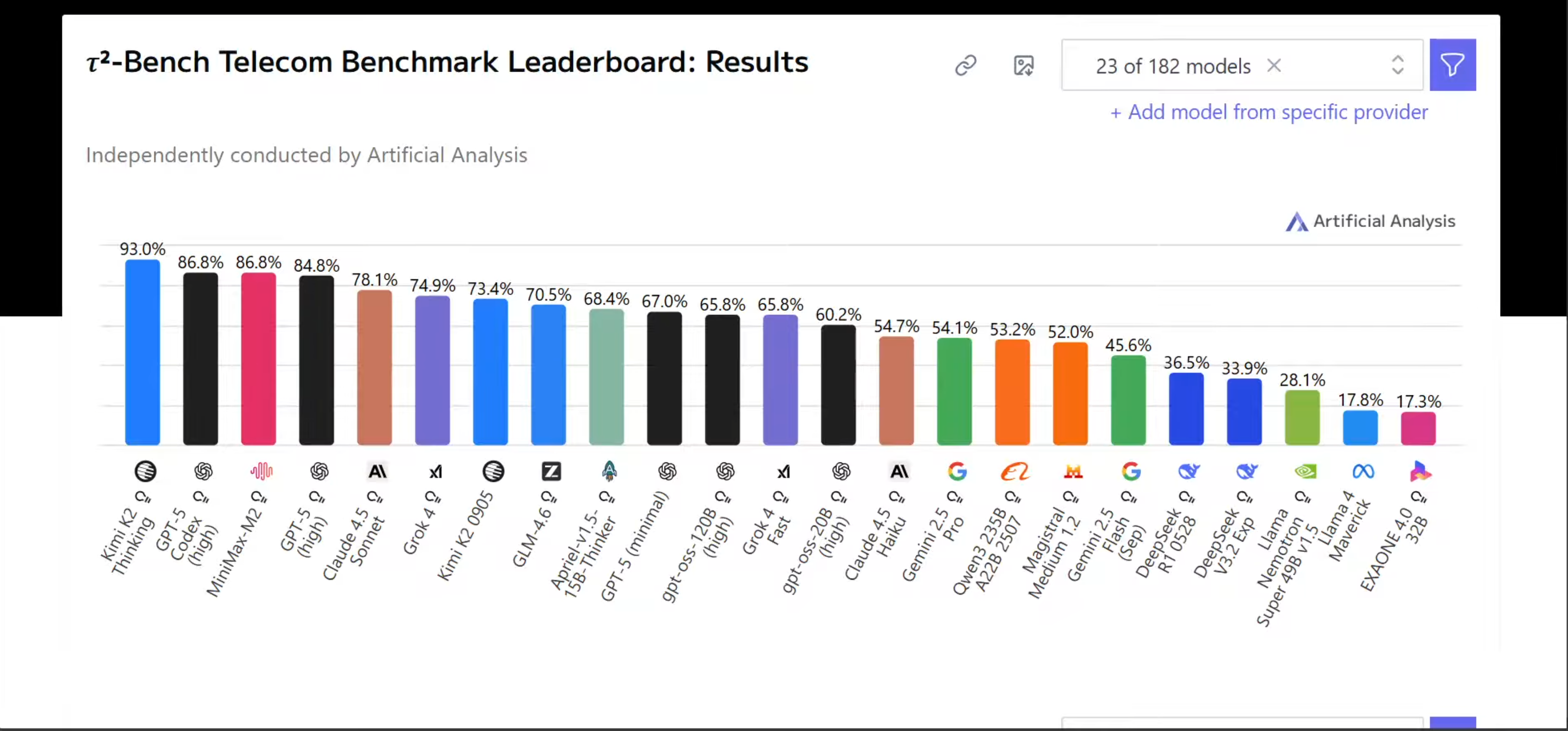 И, как оказалось, это не просто субъективное впечатление. Независимая экспертиза подтвердила: *Kimi K2 Thinking* — самая мощная агентная ИИ-модель в мире. Да, это правда. Она уже обошла *GPT-5 CodeX*, *Claude 4.5 Sonnet* и *Google Gemini 2.5 Pro* в тестировании на бенчмарке *Tower Benchmark (Telecom Test)*.