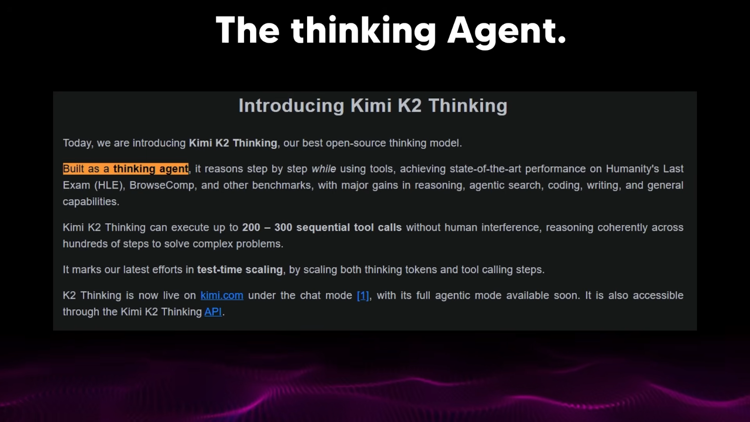 *Kimmy* представила *Kimmy K2 Thinking* — и, честно говоря, это абсолютно безумно, потому что это совсем другой тип модели. Большинство людей подумали, что это очередной стандартный релиз LLM — но это не так. Это не стандартный LLM-релиз. Это совершенно иная игра, потому что вы можете видеть выделенную мной здесь часть: Это агент мышления (*thinking agent*).