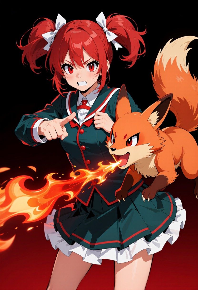 Из джойкопшен в квине. This is an anime-style digital illustration featuring a young girl with red twin pigtails adorned with white bows, fair skin, and large expressive red eyes. She is dressed in a dark teal school uniform with red accents and a white frilled skirt. Her expression is determined and intense, with her mouth slightly open, showing white teeth. She has her right hand pointing forward with a firm grip, while her left hand is positioned near her chest. Beside her, a dynamic, fox-like Pokémon with orange-red fur, large fluffy tails, and pointed ears is mid-leap, breathing a bright red-orange flame from its mouth. The Pokémon's fiery breath illuminates the surrounding area, adding intensity and movement to the scene. The background is a gradient of dark red to black, which enhances the contrast and focus on the characters. The girl's uniform has red buttons and trim, and her skirt has a white frill at the bottom. The Pokémon's fur is detailed with visible shading and texture, and its eyes are wide open with a fierce expression. Overall, the illustration uses bold lines and vibrant colors typical of anime art, with a strong emphasis on action and energy. The composition is dynamic, drawing the viewer's attention to the interaction between the girl and the Pokémon. The artist's style emphasizes dramatic expressions and dynamic poses, characteristic of anime illustrations.