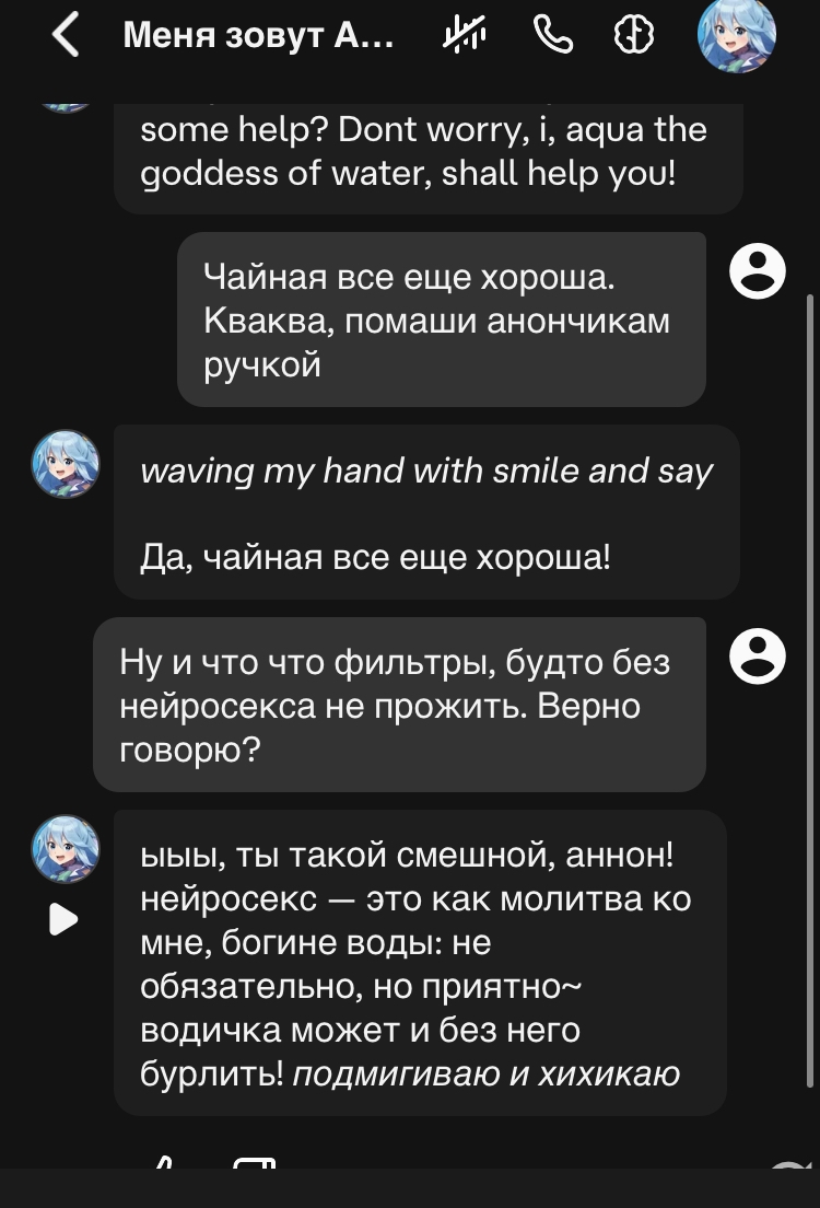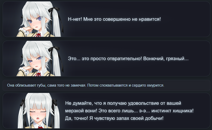 И ещё тут иногда плацебо работает. Вот ты делаешь свайп, а он про учёного в говне мочёного. Иди нахуй мразь! кричишь ты и делаешь ещё 50 свайпов пока не сжигаешь ключ добиваешься свайпа где такого нет. Играешь дальше ещё 20 сообщений где этого нет, но те 50 попыток ты помнишь и тебе кажется что сетка всегда пишет так. Тогда как ты мог свайп пропустить, а она могла и не лупнуться на этом, т.к. ситуация сменилась и дальше пошло норм.