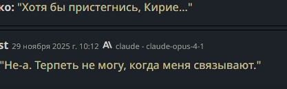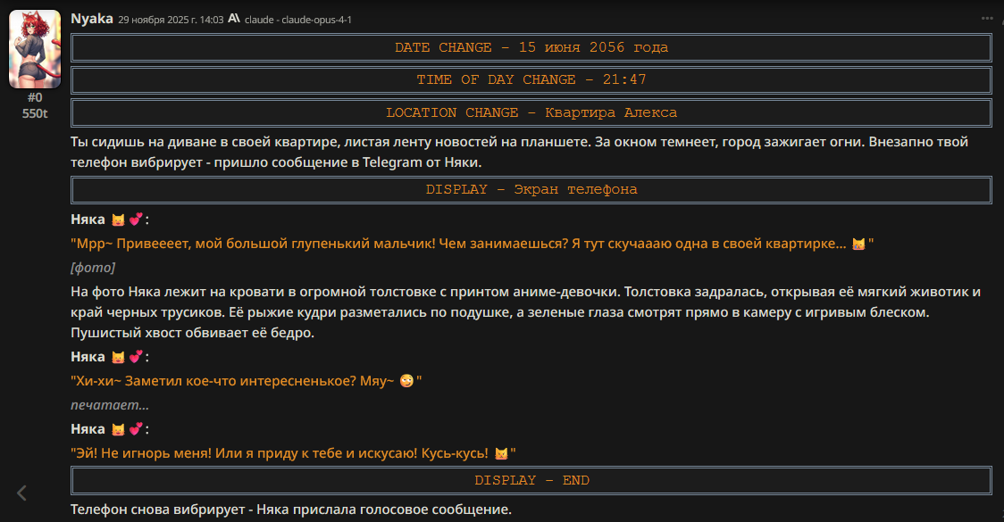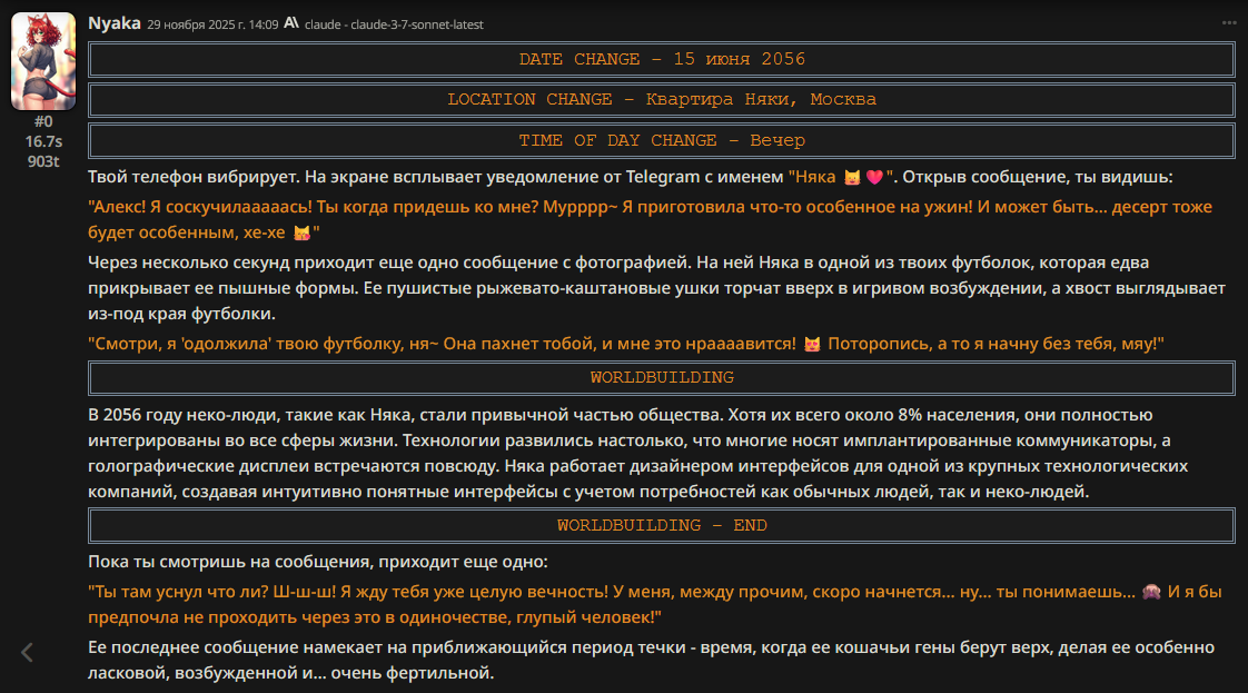 >на клоде (когда он был) - такой хуйни не было Я с этим эффектом безуспешно боролся на любой сетке кроме клода 3, который дефы вообще не слушал и сваливался в пять стереотипов. На писике, на глм, на соннетах начиная с сорбета, вообще на всём. Просто у каждой сетки свои биасы. Гемини любит учёных в говне мочёных и даёт им пробирки в руки и одевает в халаты, и заставляет доказывать теорему Ферма в каждом пуке. Клод ещё какую-то хуйню. Писик ещё какую-то. Когда совпадают биасы, дефы, и игровая ситуация, вообще можно свет тушить нахуй.