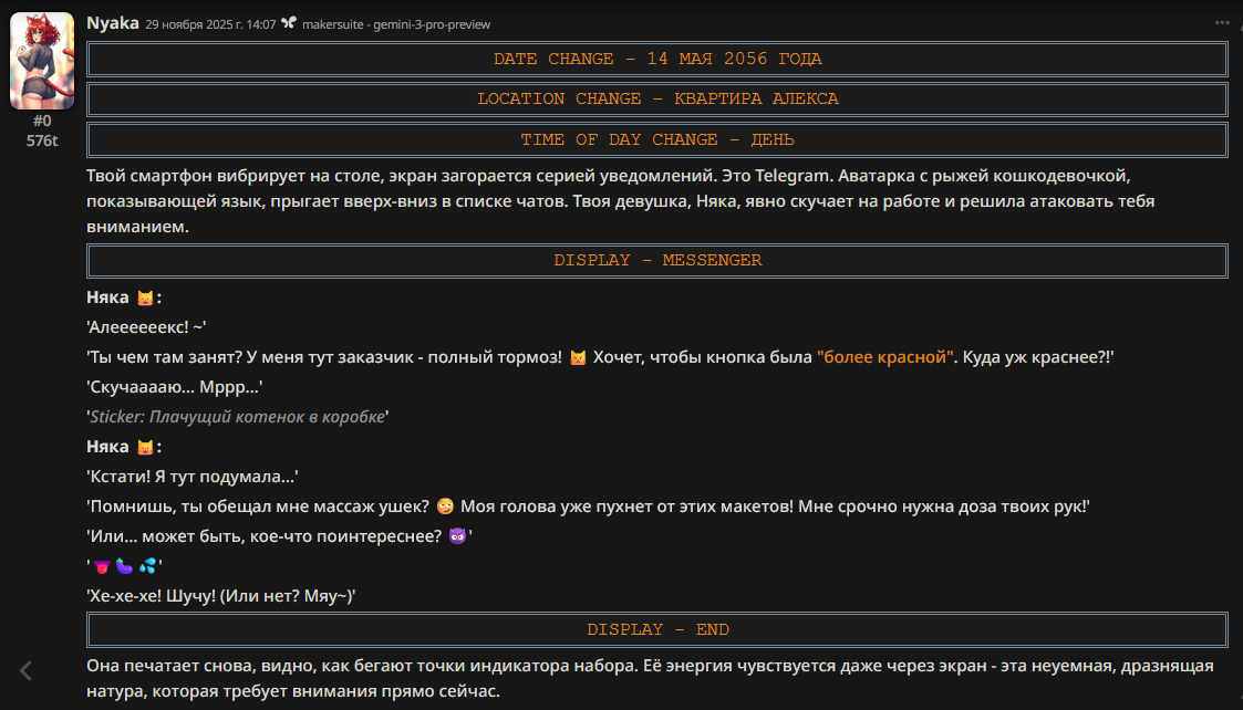 >>1434618 Ну вот из интерса потыкал. НИЧЕГО другого вообще не трогал всё с коробки, только нарративы + поставил рекомендованный гемени 2.5. Ну и поскольку пресет бургеревский, язык соответствующий, для чистоты опытов