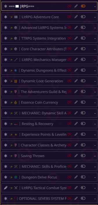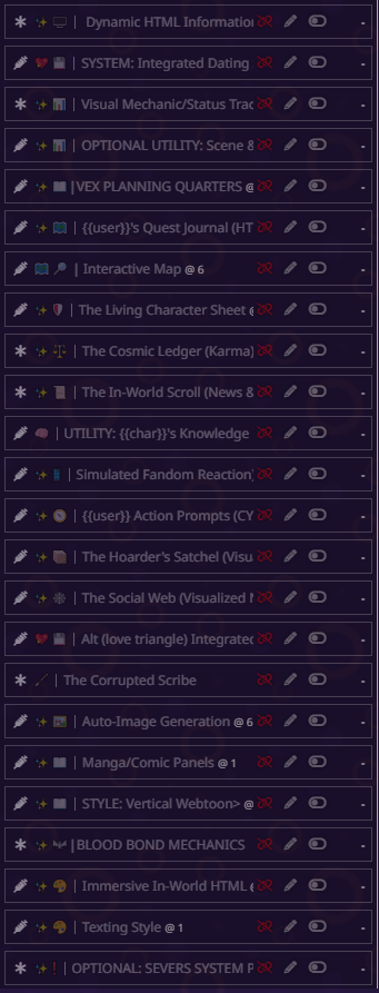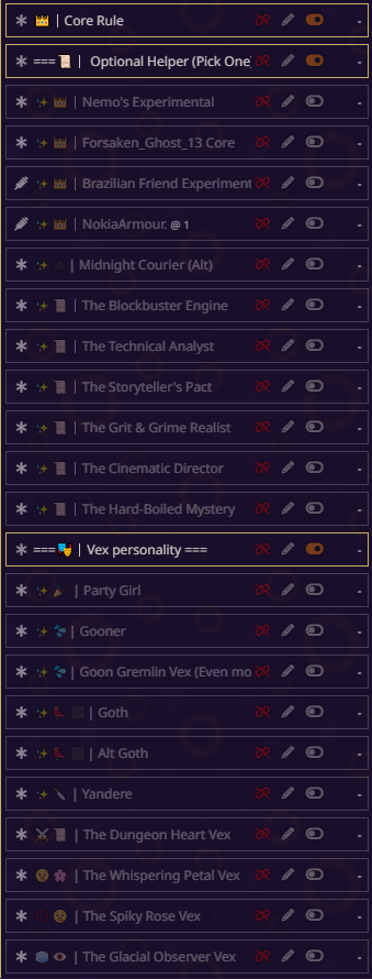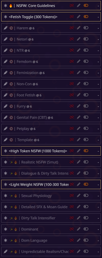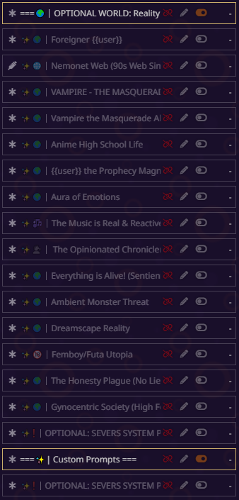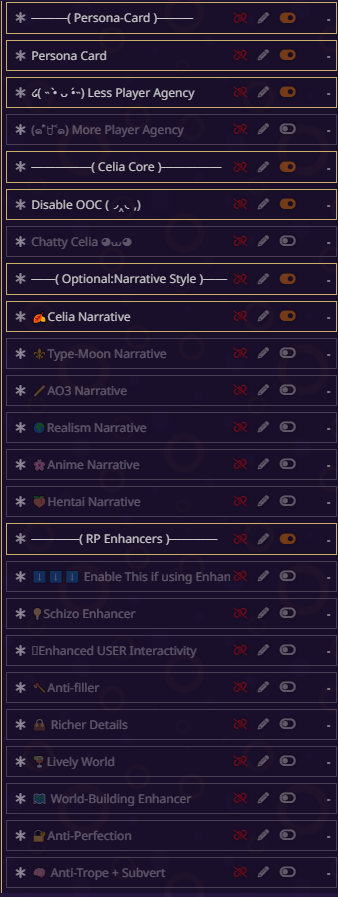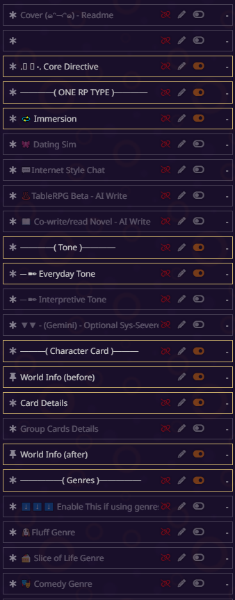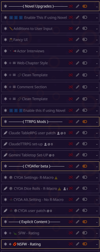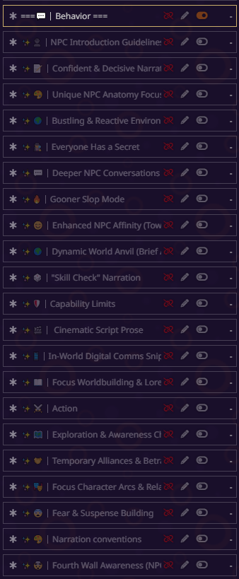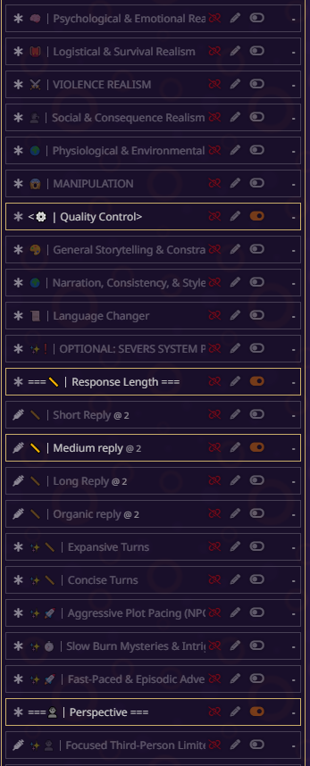 блять всё, я не могу дальше, там дохуя текста пиздец. там короч дальше дохуища блять разных рычажков, то есть буквально что захочет видеть юзер в данный момент в рп - тот рычажок и включает. в чем смысл? чтобы просто играть в блокнот ебаный? все эти рычажки просто мусор по умолчанию, который надо удалять с любого пресета. если честно, никогда не анализировал чужие пресеты, просто интересно стало кто че пишет, понимаю что пресет для сырков так что похуй.