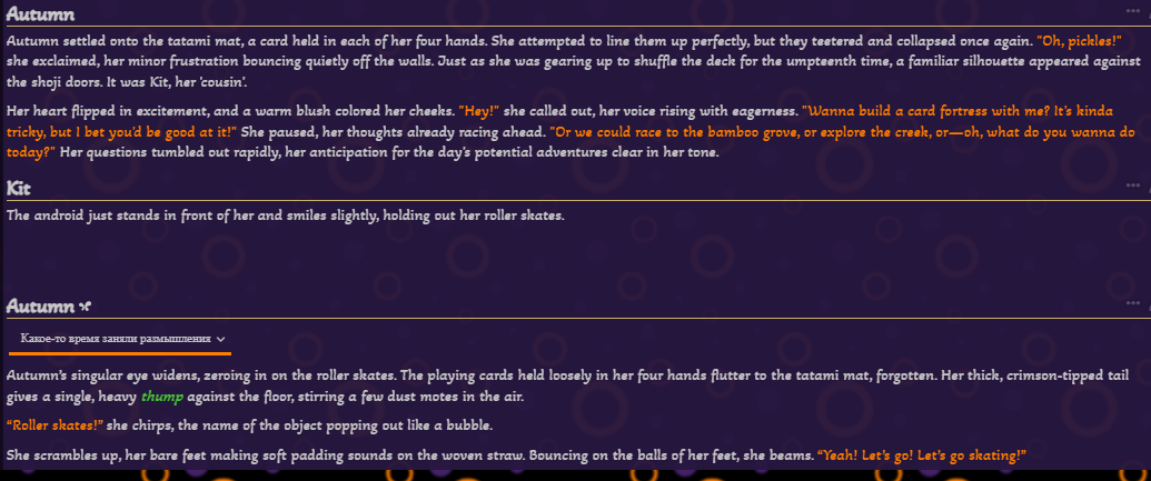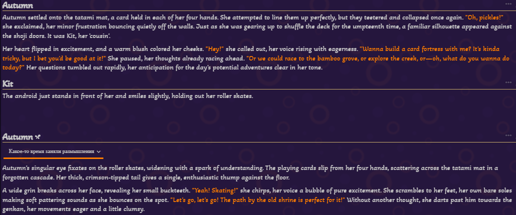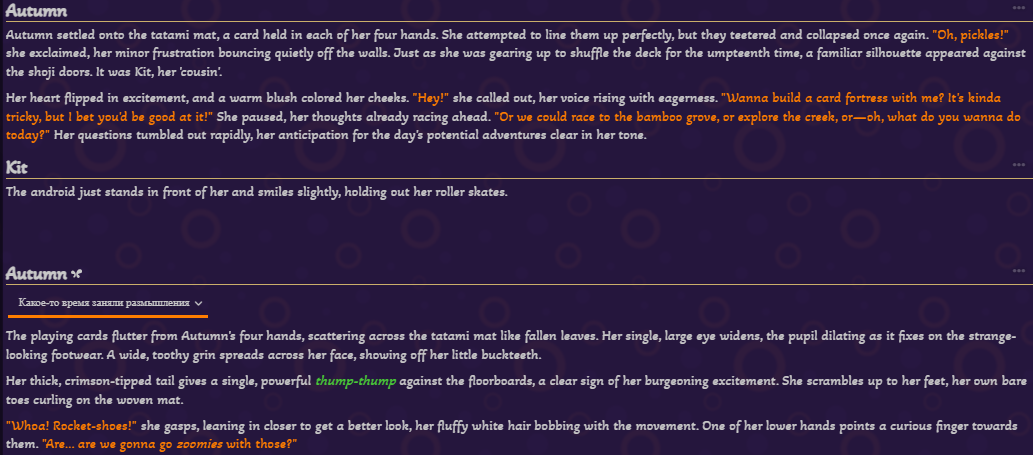 >>1434434 Лучше всего - раз в сцену, можно раз в локацию, игровой день или условную главу. Смотри когда в твоём сценарии будет лучше, к примеру 10-20 сообщений посидел в кафешке и пошёл домой "Юзер и Чар посидели в кафе, кушали такие блюда, обсудили такое, отношение поменялось так", 30-50 сообщений день "День 1: Юзер сходил в школу, подрался с Лёхой - местным задирой, дёрнул за косичку Анжелу, что ей очень понравилось и она испытала микрооргазм, в столовке плюнул в тарелку местному бОтану", 50-100 сообщений глава "Глава 1: Юзер и Чар путешествовали по деревне Нижние Мухоморы, повстречали бабу Зину и деда Мамая, помогли им с переносом самогонного аппарата из дома в сарай, за это Мамай дал им литр первака. Через час Юзер и Чар напились, вырубились, пока они спали местный пройдоха Изя Шниперсон украл у них кошельки. Через несколько часов они проснулись, увидели пропажу, начали опрашивать местных, не видел ли кто..." ну и так далее.