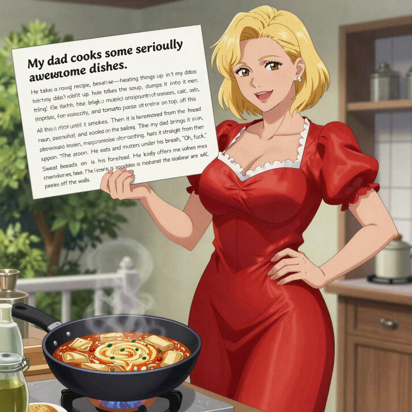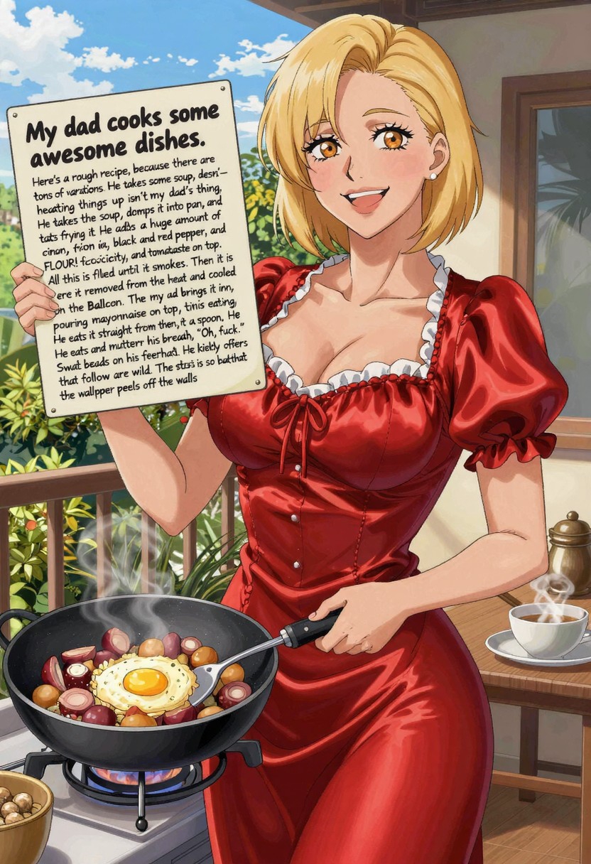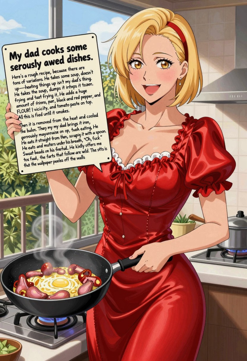>>1434692 Я не особо старался Anime milf European woman with short blonde hair mistress wearing beautiful silk red dress smiling holding a sign that saying "My dad cooks some seriously awesome dishes. Here's a rough recipe, because there are tons of variations. He takes some soup, doesn't heat it up—heating things up isn't my dad's thing. He takes the soup, dumps it into a pan, and starts frying it. He adds a huge amount of onions, garlic, black and red pepper, and FLOUR! for viscosity, and tomato paste on top. All this is fried until it smokes. Then it is removed from the heat and cooled on the balcony. Then my dad brings it in and, generously pouring mayonnaise on top, starts eating. He eats it straight from the pan, scraping it with a spoon. He eats and mutters under his breath, “Oh, fuck.” Sweat beads on his forehead. He kindly offers me some sometimes, but I refuse. Needless to say, the farts that follow are wild. The stench is so bad that the wallpaper peels off the walls"