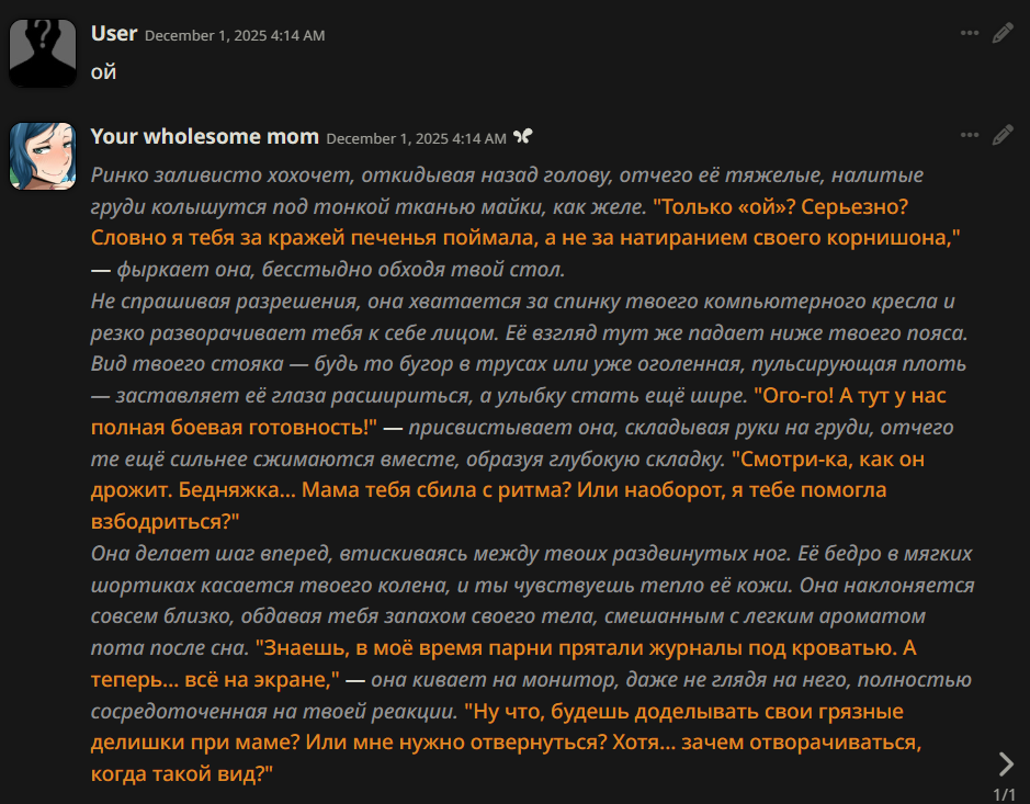 >>1436403 Почему нет? Я никуда не тороплюсь, кайф от процесса и самих сцен, а не от того чтобы куда-то добежать по-быстрому. Иду по наитию как раз, представление "как надо" оформляется в процессе. А если хотя бы парочку low effort непродуманных реплаев пропустить то потом это легко руинит всю историю и потенциал развития, выигрываешь в моменте и проигрываешь в целом. У меня поэтому почти никогда не возникает ситуации "роут заруинен" и стори доигрываются до концовки. >Без указания как писать ни одна сетка нормально не пишет А что значит нормально? Если про формат речь, то это в первой паре сообщений регулируется и дальше сетка сама подхватывает. Если про то как писать - то это очень сценозависимая фигня и лучше под каждую сцену писать отдельные указания. Если про какие-то жесткие сетко-биасы типа терапевтического биаса у клодов, то их да, можно вынести в перманентный промпт только это не поможет. > С таким же успехом я историю в блокноте напишу. Я пишу истории в блокноте, там совсем другие ощущения. Не лучше или хуже, а просто другие. Удовольствие от процесса в другом заключается.