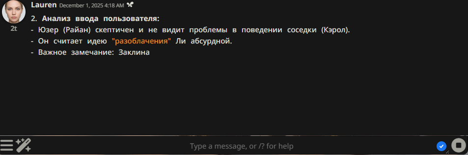 >хорошая ли идея привязывать лорбук к ней? Нишевая штука. Лорбук нужен для динамического подсовывания в контекст чего-нибудь по триггерам. Обычно это юзается для создания секретов и двуличных/шизоидных персонажей, чтобы скрытой части до поры до времени не было в контексте вообще, и нейронка за счёт розового слоника не выболтала раньше времени. Самое логичное применение для персоны: положить в такой лорбук куски своей бэкстори, которая будет вызываться только после того как ты расскажешь их чару.