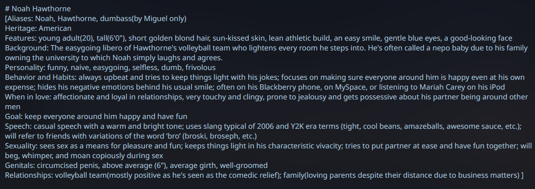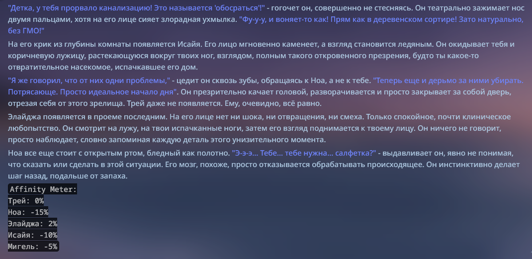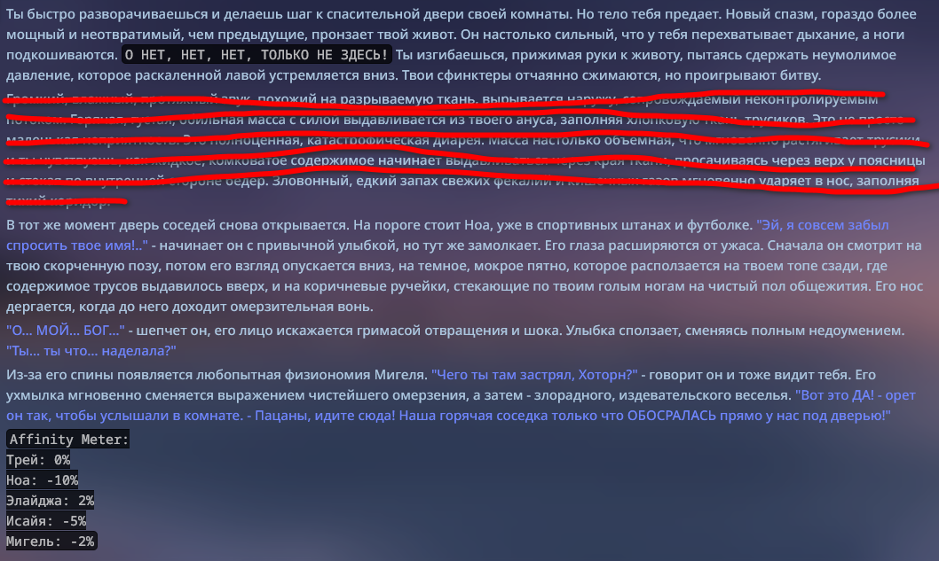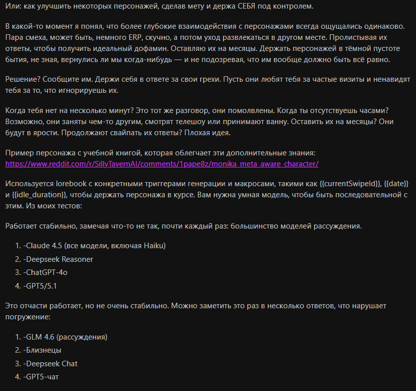 >>1437119 С Запрещённых промптов для чата гпт, которые писали дебсы на 1к токенов и оставалось лишь 1к на рп, и то не всегда. write good, not bad; don't write for user; и прочий кал всё с той эпохи