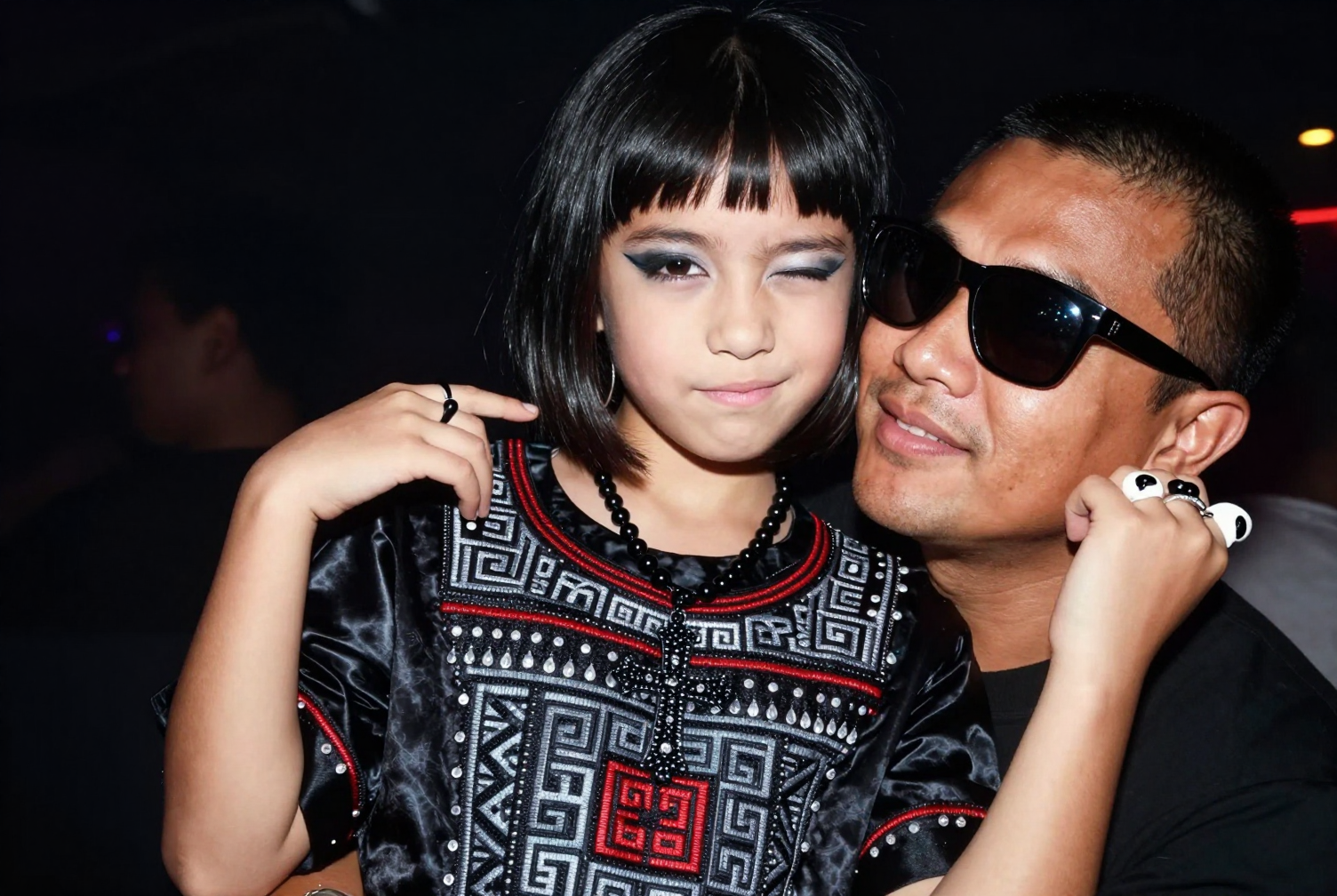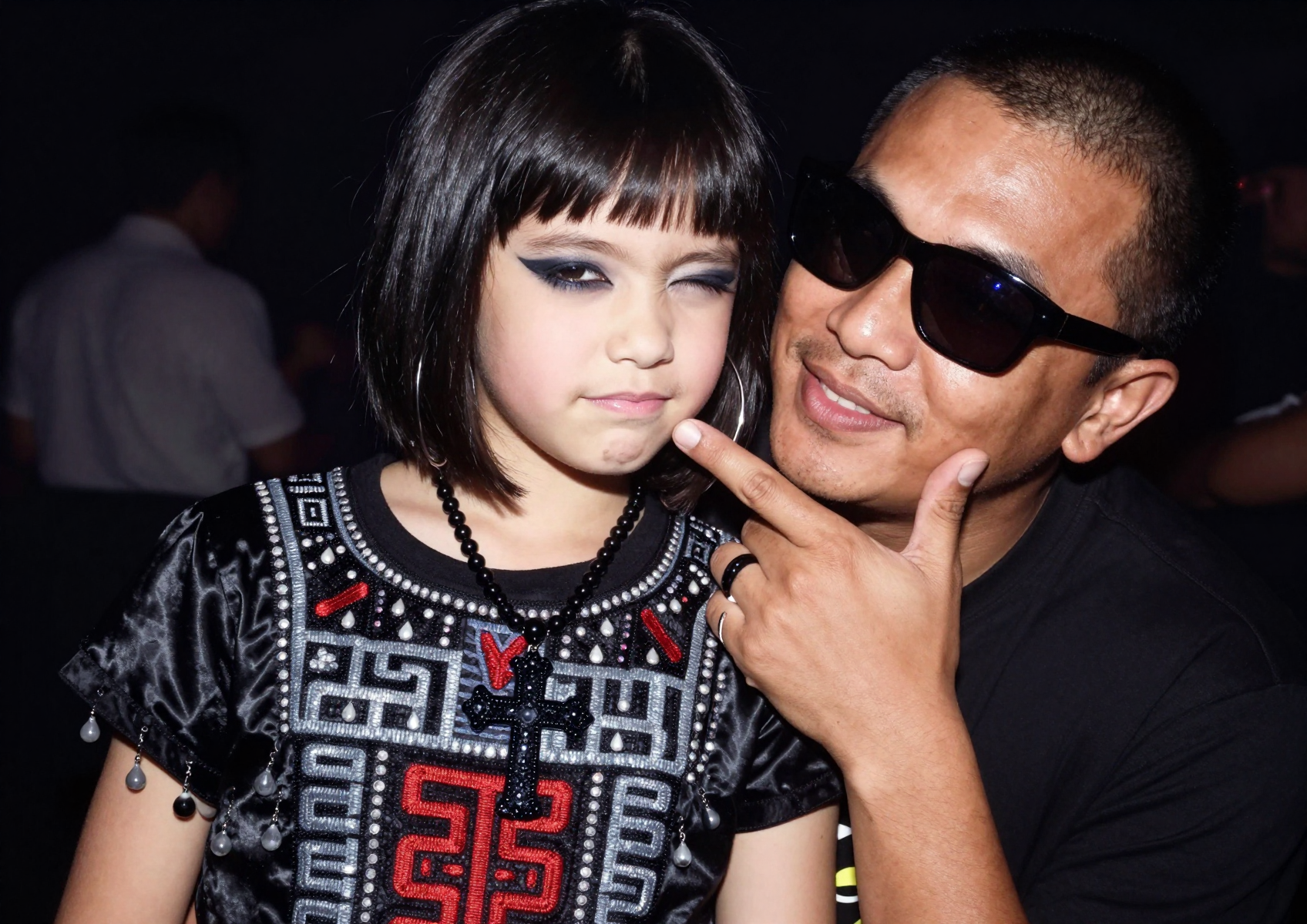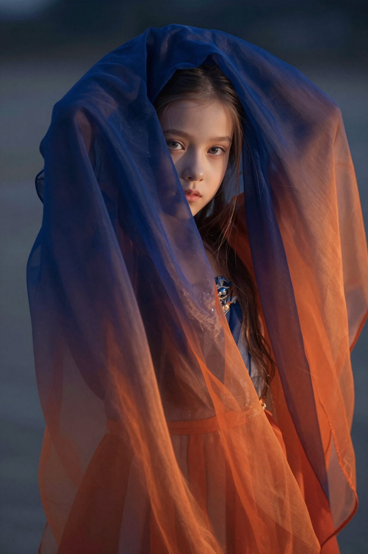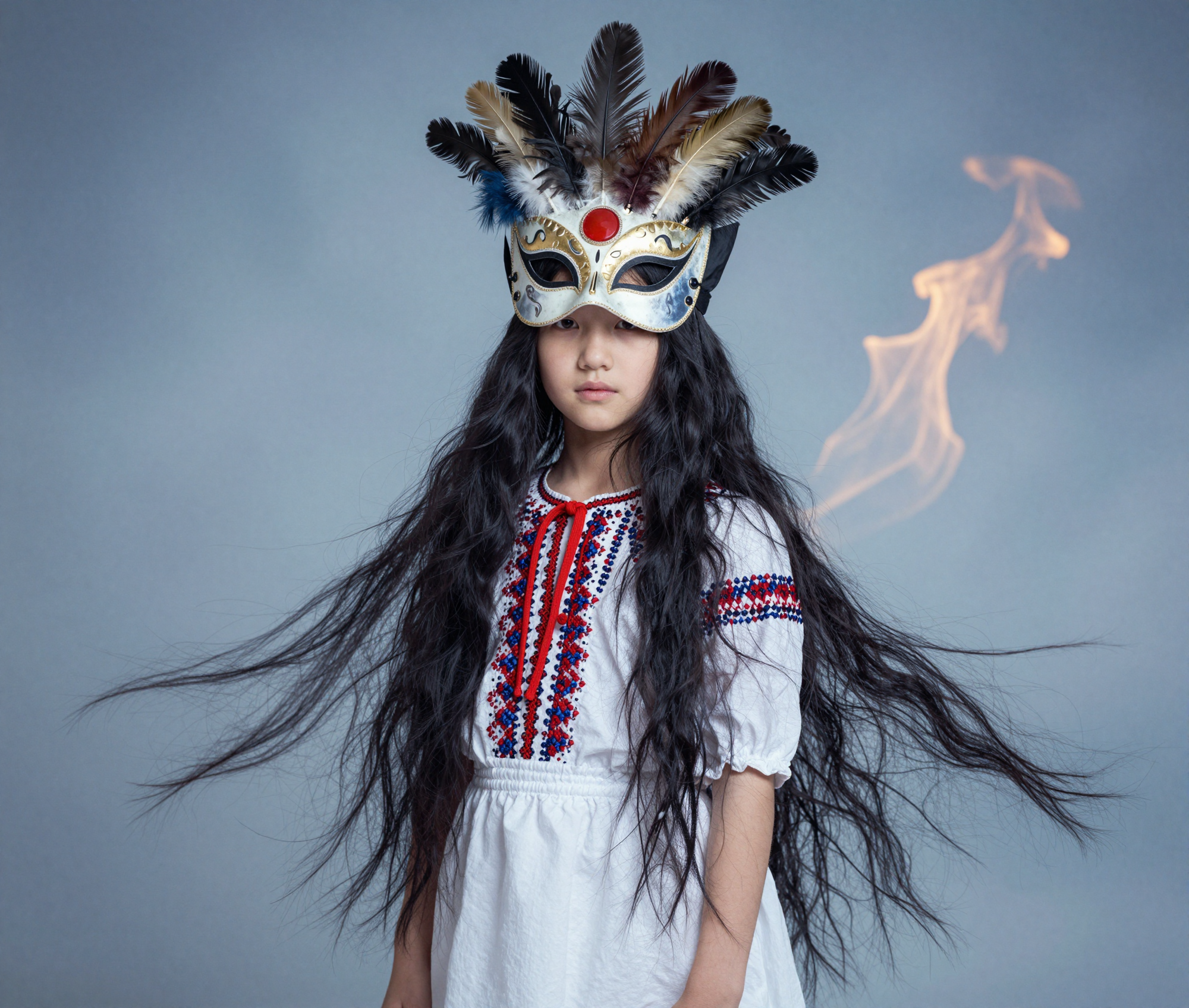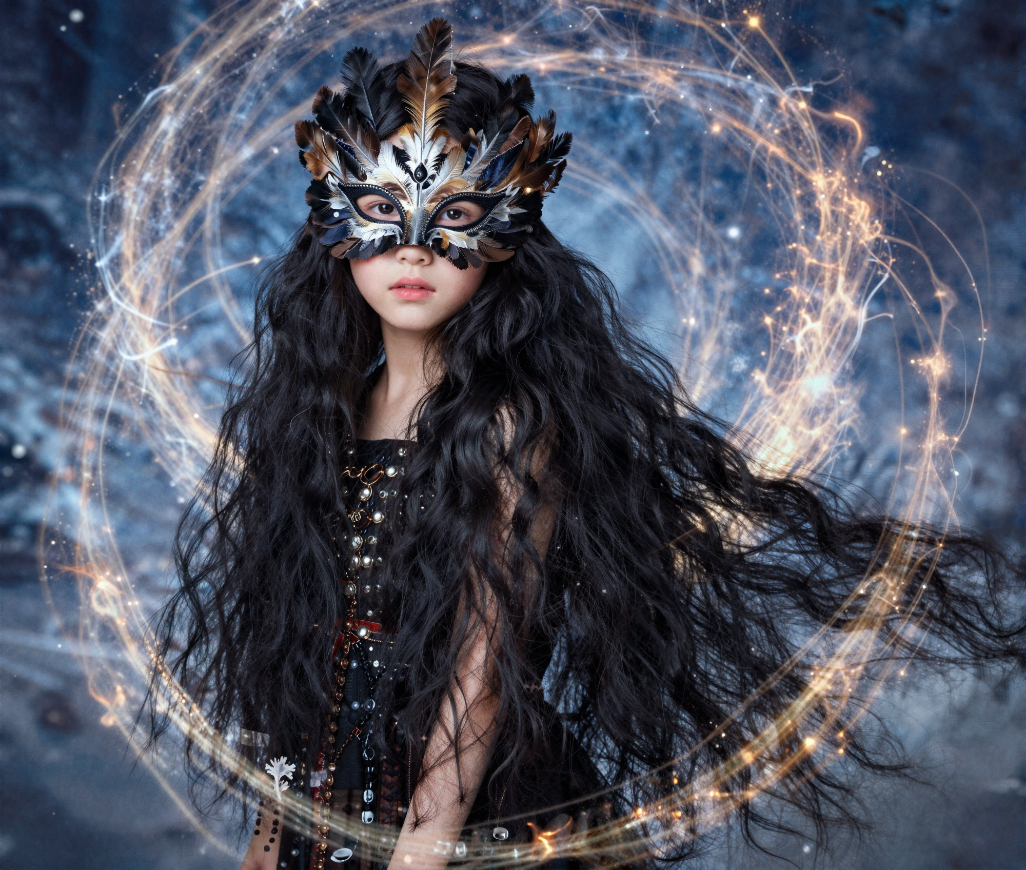 >девочка 9 лет. Похоже, она принадлежит к цыганской расе и представлена в молодом возрасте. У девочки длинные, ярко-черные волосы, ниспадающие каскадом на плечи. она в волшебном мире кружащегося снега и огня. на ней маска из перьев