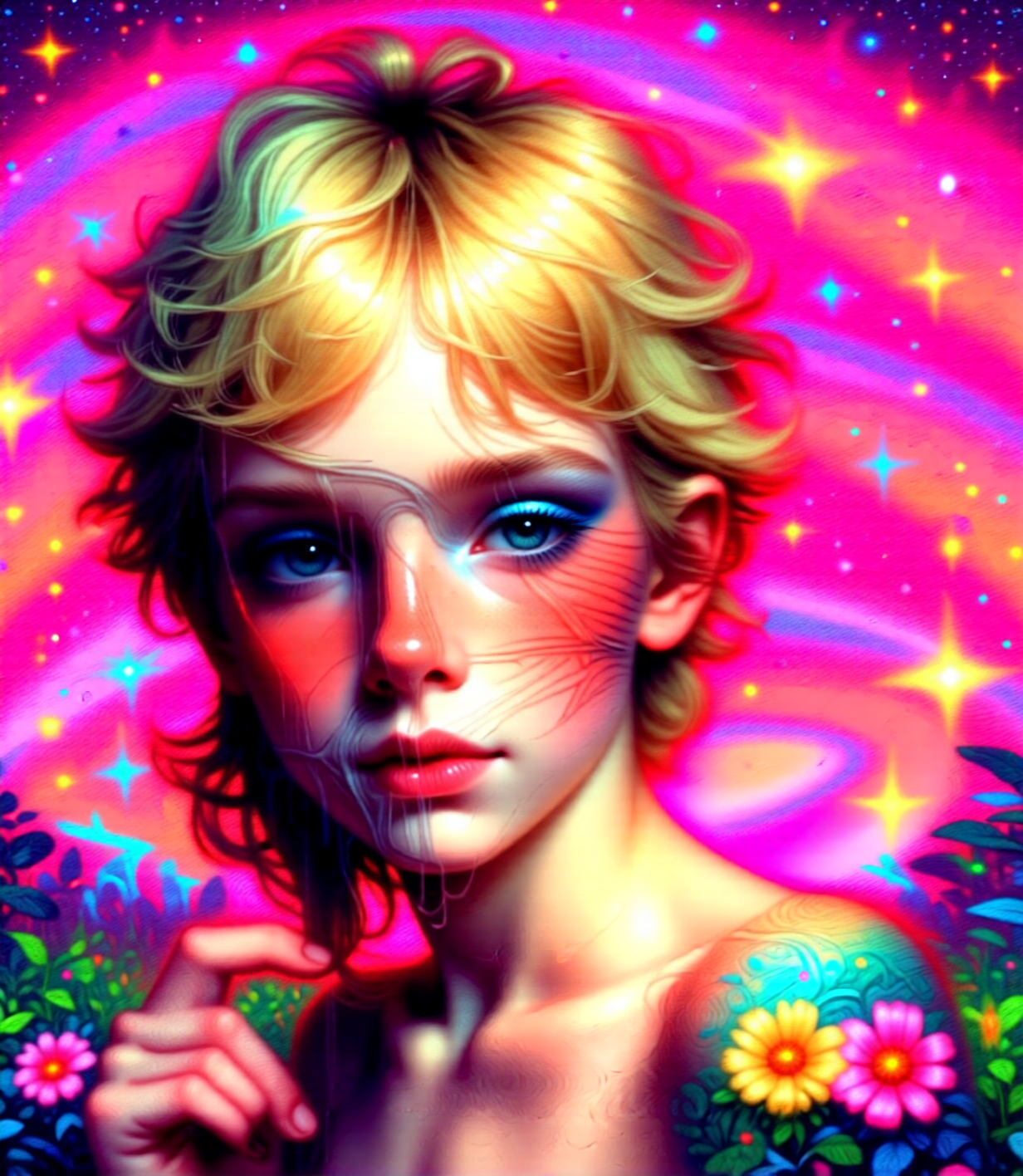 И всетаки квен рапид на 4 шага (пик 1) круче зетимаже (пик 2) Скорость генерации, на моей 3050: 21с для Qwen Rapid 4s (4 шага) 46с для Zimage (9 шагов, Q6_K) Промпт: Conceptual makeup of shimmering pollen and dust, a fairy boy with blond hair and ethereal, translucent skin. His face holds a secret: there are faint, ghostly symbols blurring beneath the surface. Optimal shadows, complex depth of field, dramatic lighting, clear focus, 8k, high quality, Fujifilm filter, surreal, a dreamy pastel wonderland, bright colors, a starry pink background, realistic.