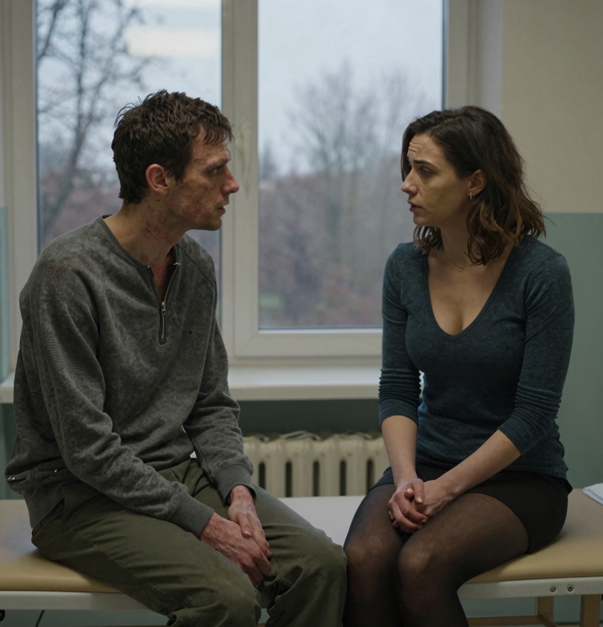 Создай картинку/фотографию в стиле ... с двумя персонажами: Анна - девушка 19 лет в зеленом свитере, блондинка ... Ольга - женщина 40 лет, в форме полицейской, ... На изображении персонажи в комнате (описание комнаты), Ольга сидит за столом, Анна стоит у окна. Ольга что-то пишет в тетради. У Анны в руке кружка с кофе. ...