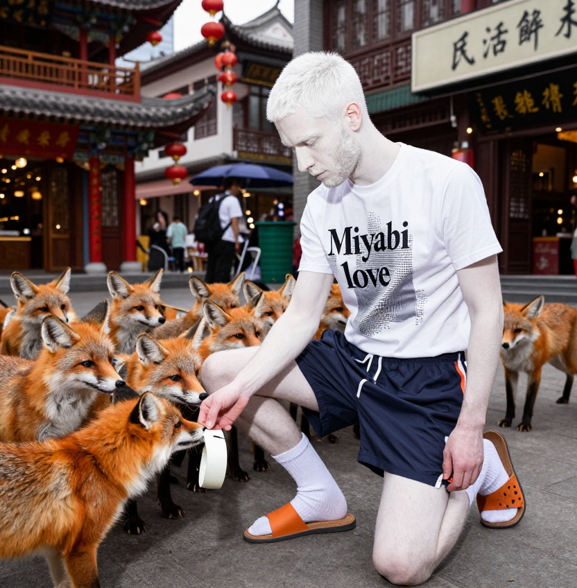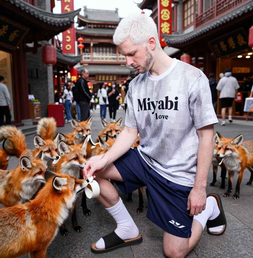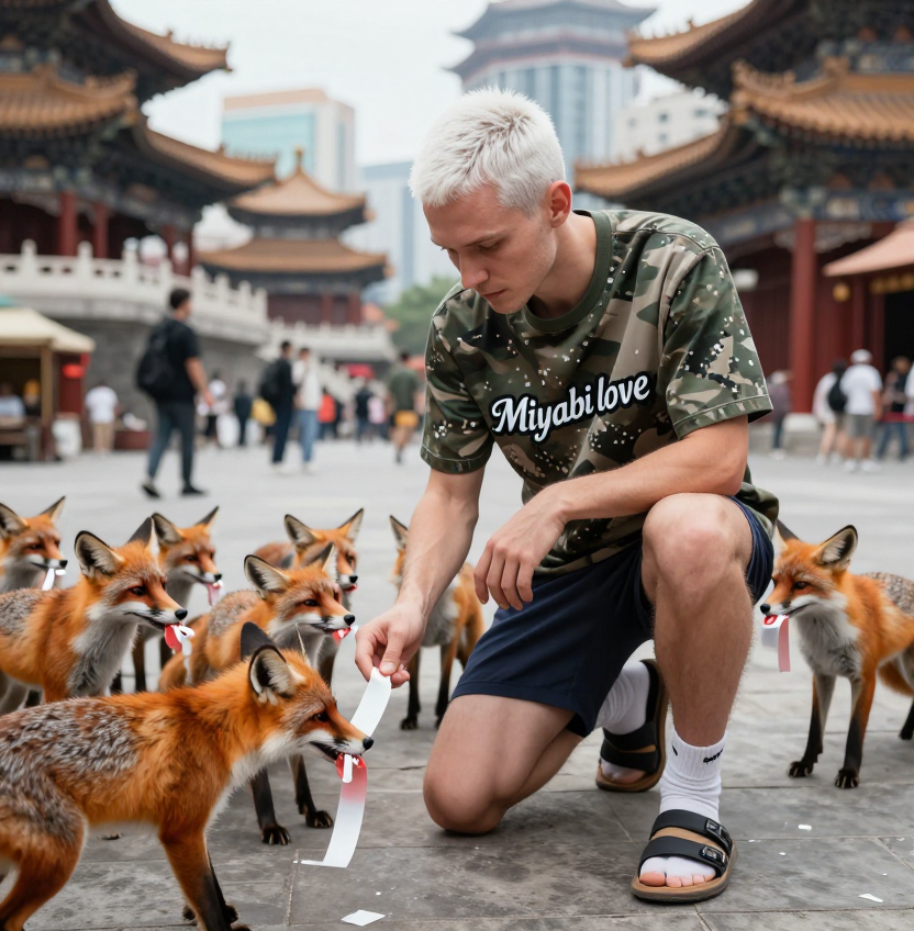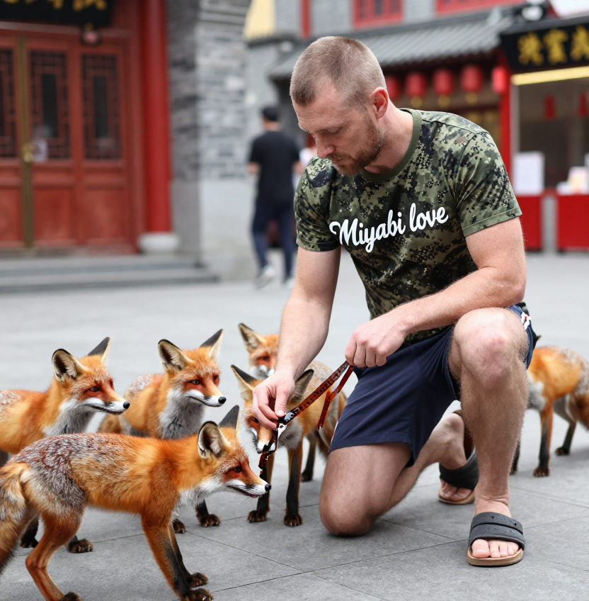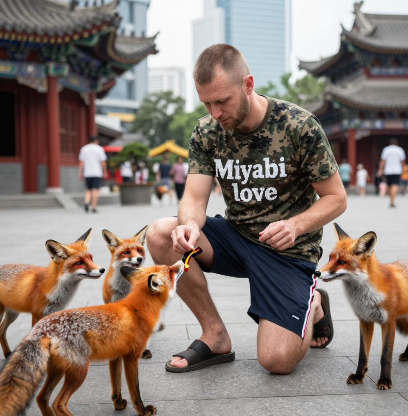 > Короткостриженый с недельной небритостью белый мужчина плохой внешностью 30 лет одет в спортивные шорты, сандали с носками и футболку с милитари-расцветкой в пиксель. На футболке мужчины надпись "Miyabi love" Находится в китайском современном городе с китайскими достопримеательностями. foxes gathered around the man foxes are eating film tape man on one knee is feeding film tape to foxes Что я могу сказать? Z модель цензурирует носки с сандалями!