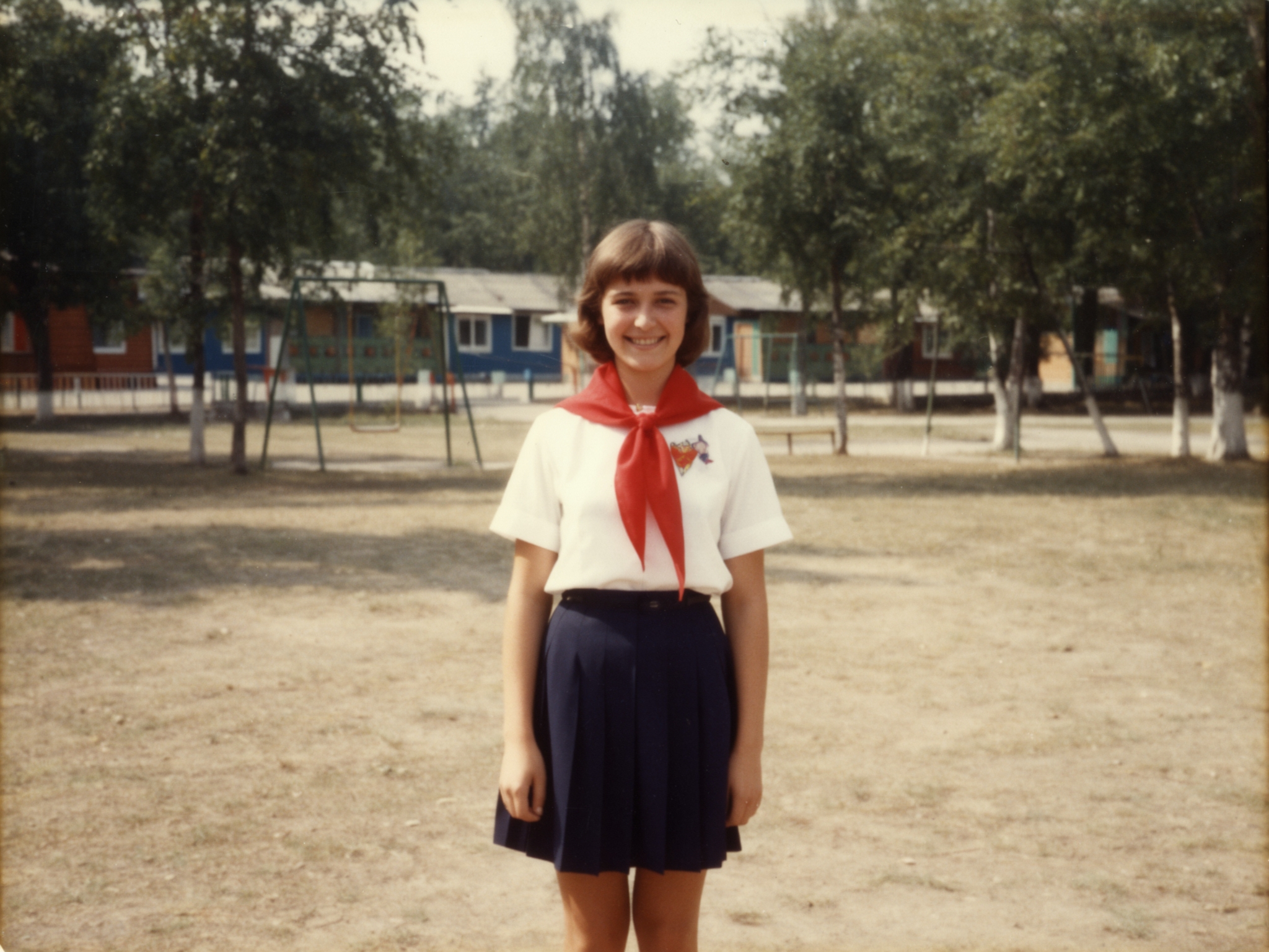 Так я не понял, мне натвиз дмд2 удолять штоли? Image is a photograph taken from a low-angle perspective, looking up at a young woman bending over. She has light brown hair that falls to her shoulders and is wearing a white button-up shirt with short sleeves. She also wears an orange and white plaid mini-skirt that is lifted up, revealing pink panties underneath. The photograph emphasizes her legs which are spread apart. Her face is visible through the gap between her legs, and she is smiling slightly. In the background, there are trees with green leaves and a cloudy sky. There are also streetlights visible in the distance. The colors in the image are vibrant, with the orange of the skirt standing out against the more muted tones of the shirt and background. The texture of the plaid pattern on the skirt is clearly visible, as is the fabric of the shirt and the smoothness of her skin. The photograph has a dynamic, almost playful feel due to the low-angle perspective and the subject's playful expression. The overall composition draws attention to the contrast between the subject's brightly colored clothing and the natural background. The lighting is natural, and the image has a slight HDR effect, giving it a vivid and somewhat exaggerated appearance. The subject appears to be outdoors, possibly in a park or suburban area.