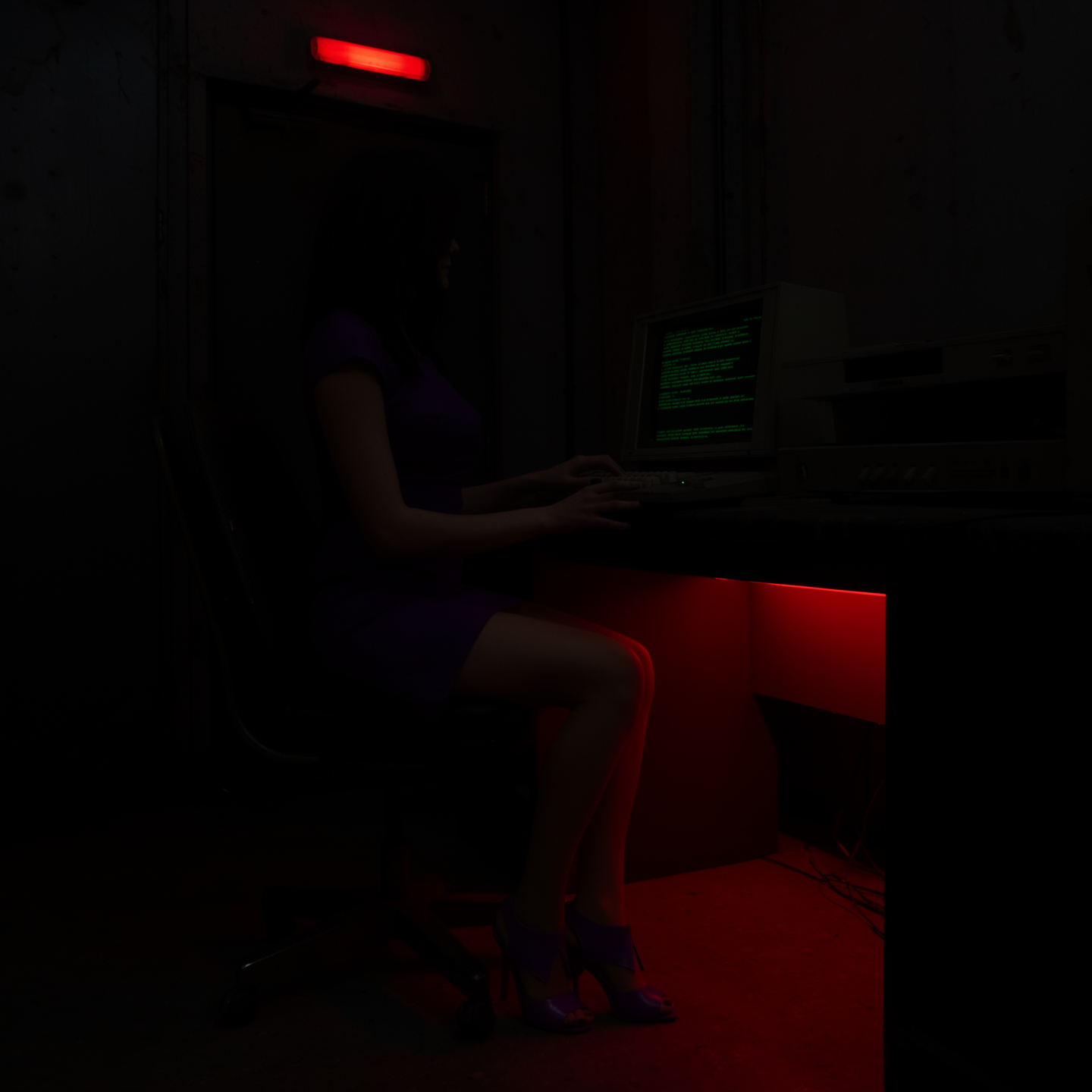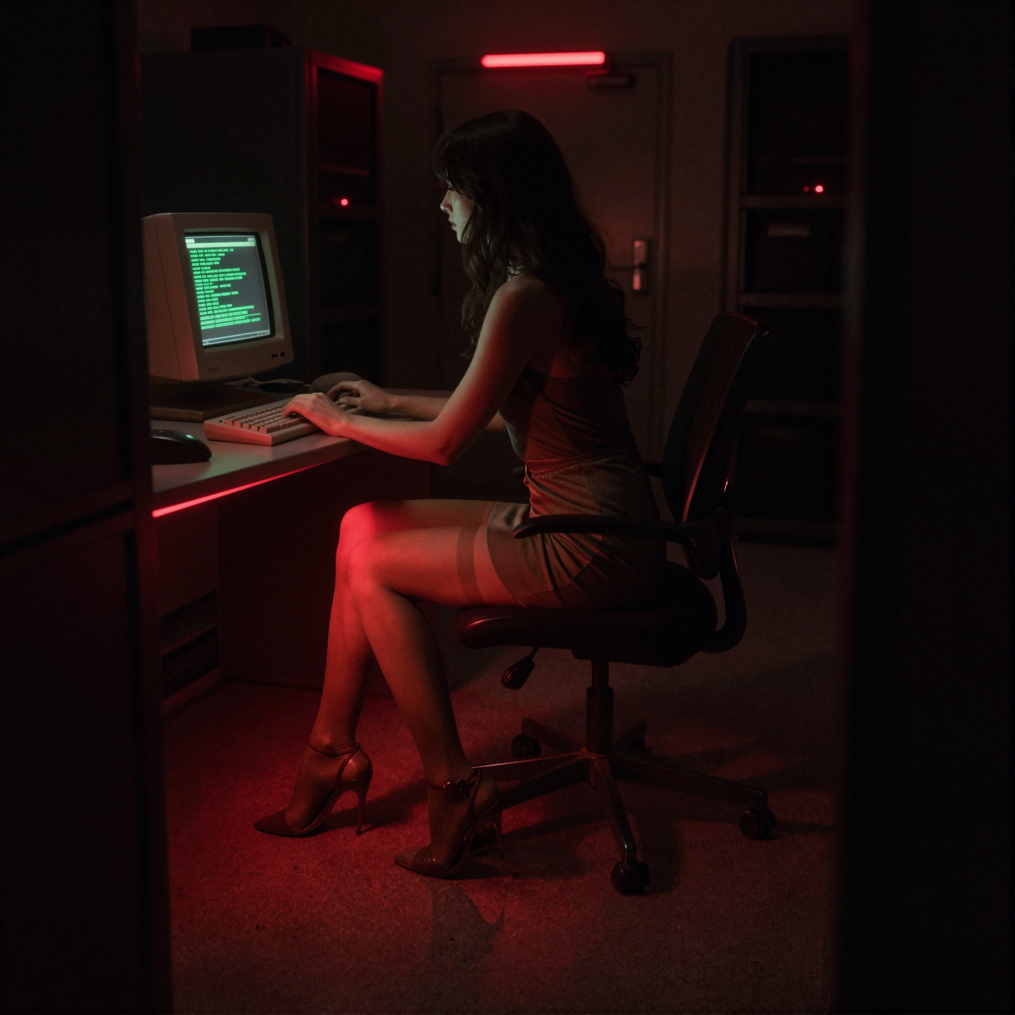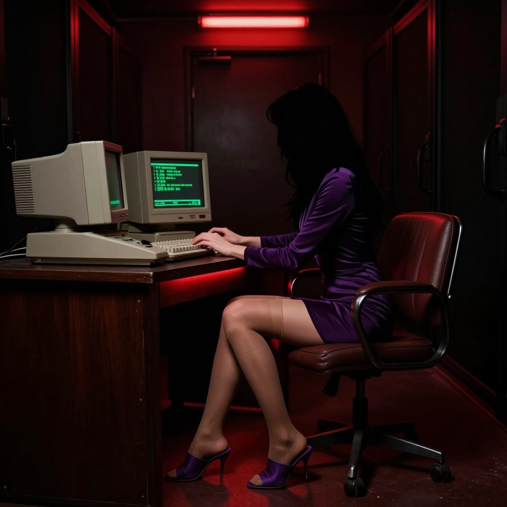 Prompt: A very dark, shadowy, dim digital photograph of an old dark server room, old computers, red light above the door. A barely distinctive dark silhouette of a beautiful girl in deep purple minidress, tan sheer nylon stockings, deep purple revealing slide open-toed stiletto mules, is sitting on the vintage computer chair at the deep shadowy desk with a vintage 70's computer terminal, green text, in the dark, typing. Dark image, dramatic deep dusk red low-key lighting. Very bright contrast red backlight under the desk.
