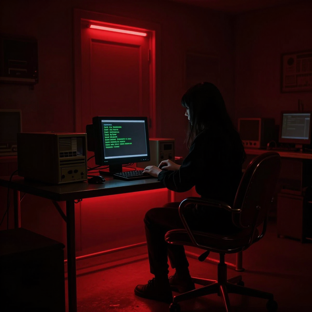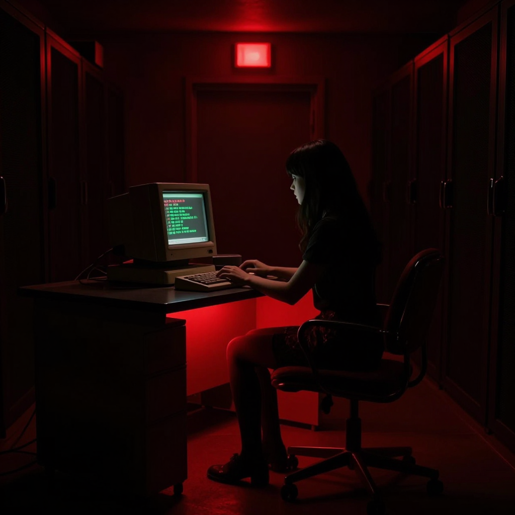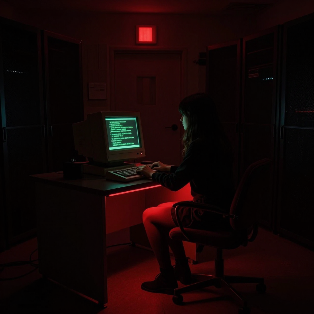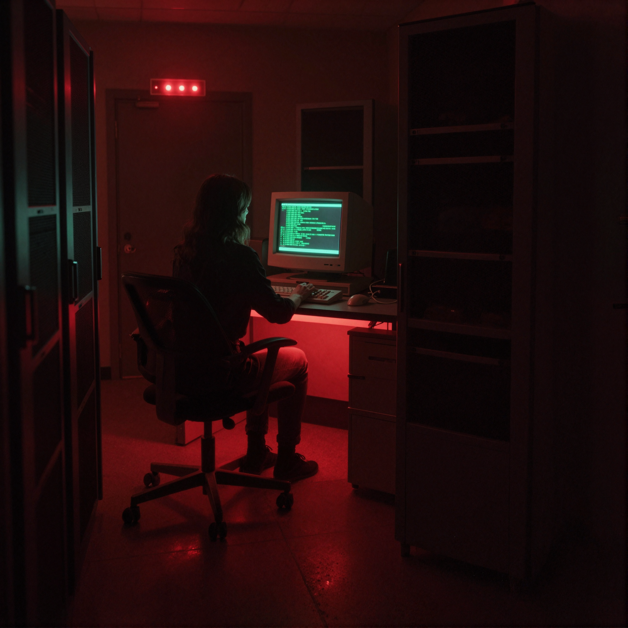 Prompt: A very dark, shadowy, dim digital photograph of an old dark server room, old computers, red light above the door. A barely distinctive dark silhouette of a beautiful girl in deep purple minidress, tan sheer nylon stockings, deep purple revealing slide open-toed stiletto mules, is sitting on the vintage computer chair at the deep shadowy desk with a vintage 70's computer terminal, green text, in the dark, typing. Dark image, dramatic deep dusk red low-key lighting. Very bright contrast red backlight under the desk.