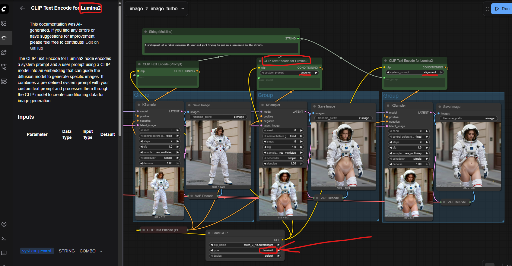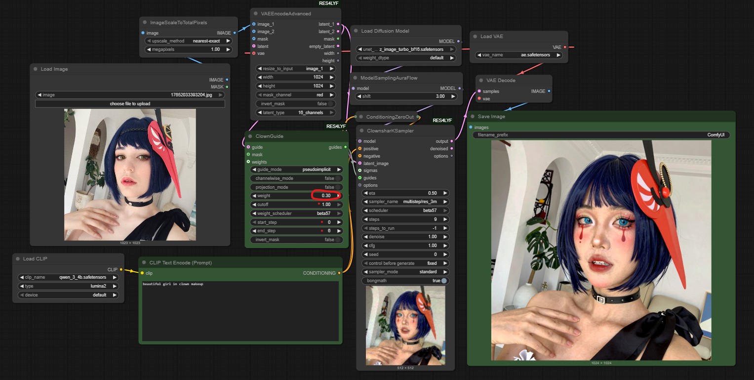 >>1446882 Склепал воркфлоу для легких модов для Z Image Turbo (в пик1). Без ресемплинга, работает быстро, чуть дольше обычной генерации. Крутить нужно параметры в ClownGuide. У этой ноды есть много режимов работы guide_mode. Что-то показывается в примерах, но многое не понятно. Почитать было подробную инструкцию. Семплер 3s даст гораздо лучшее качество, но дольше.