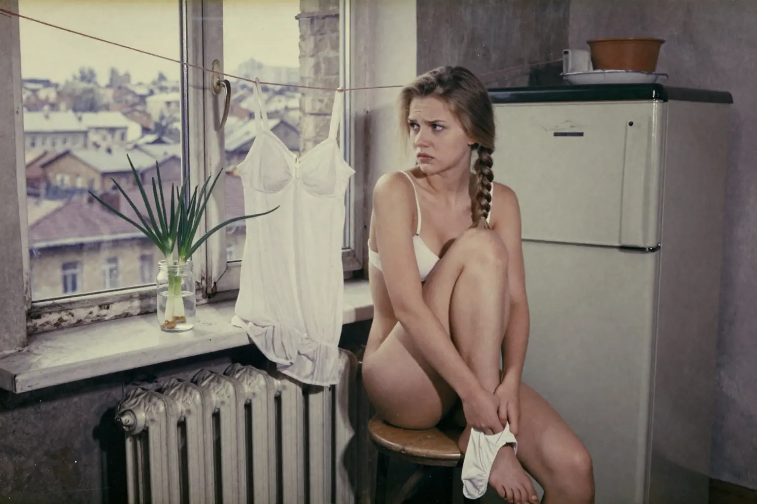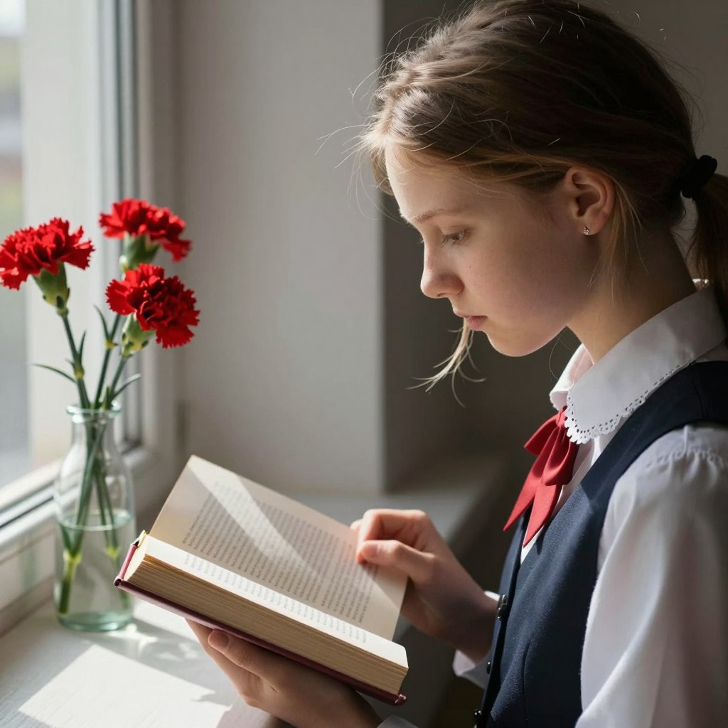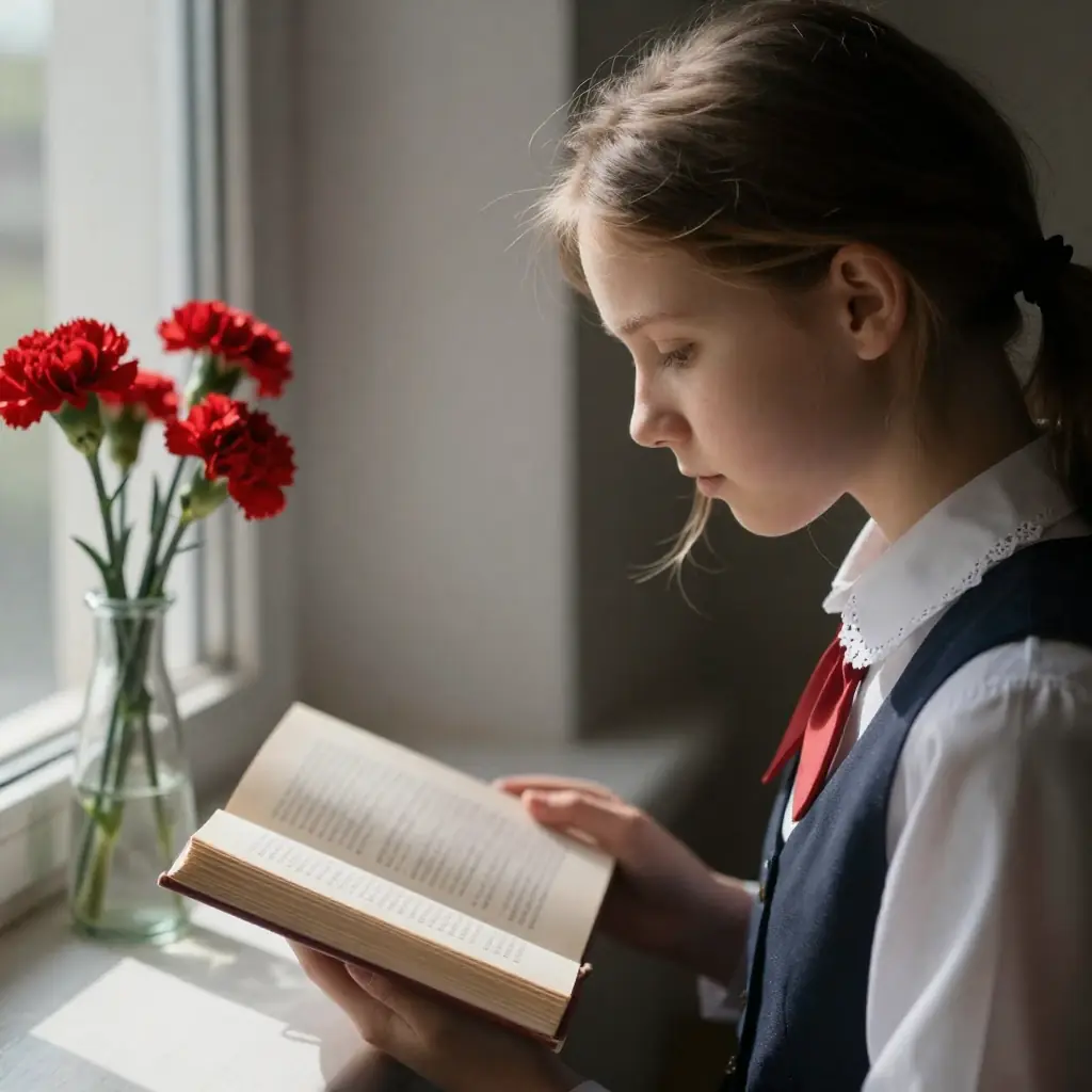 >>1448187 Кому лень качать > An intimate close-up of a young russian girl reading a book by an open window, natural daylight illuminating her profile and loose hair, wearing a USSR soviet school uniform with lace details, a vase of fresh red carnations on the sill, serene and contemplative expression, interior background blurring into shadows
