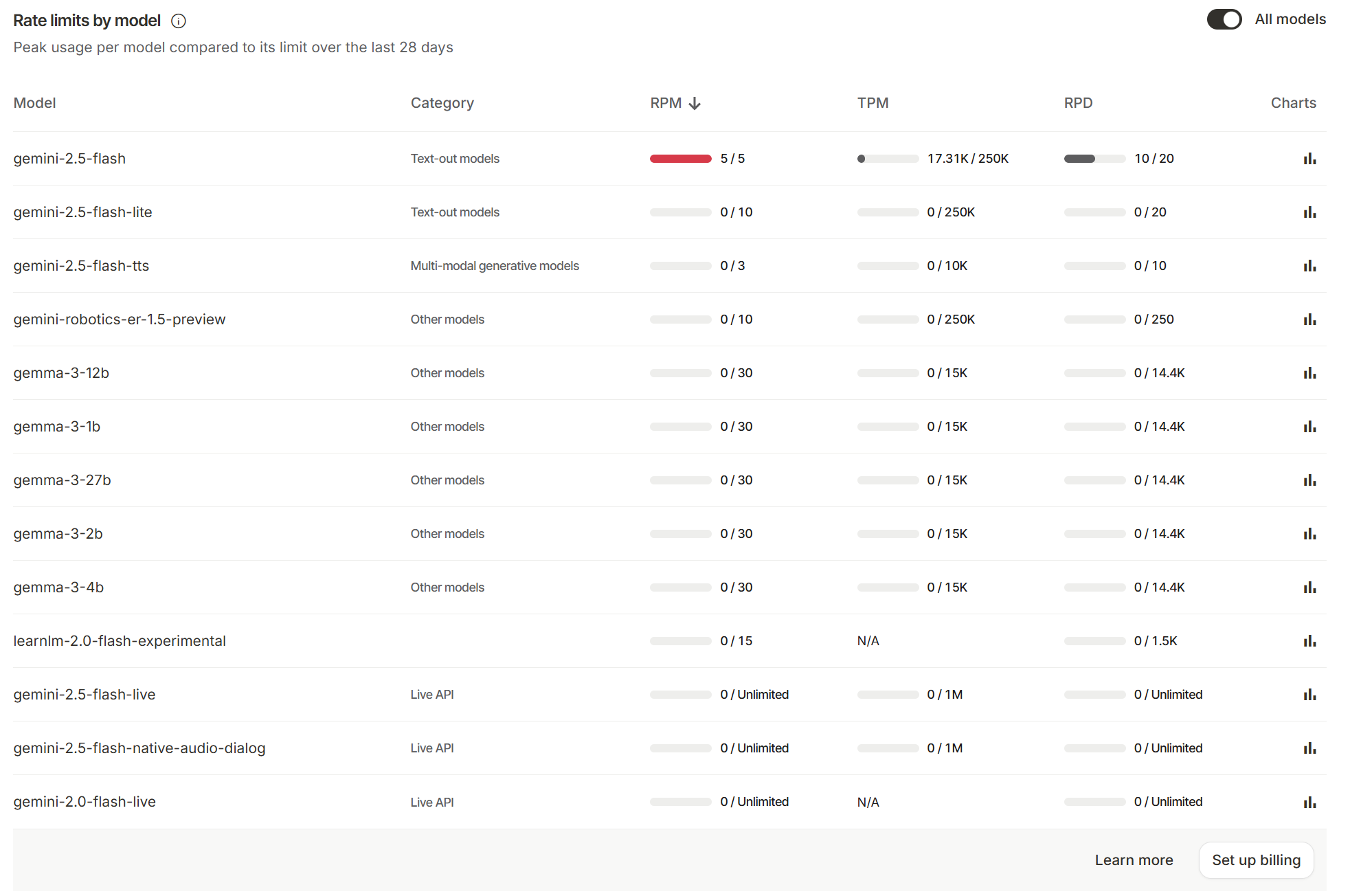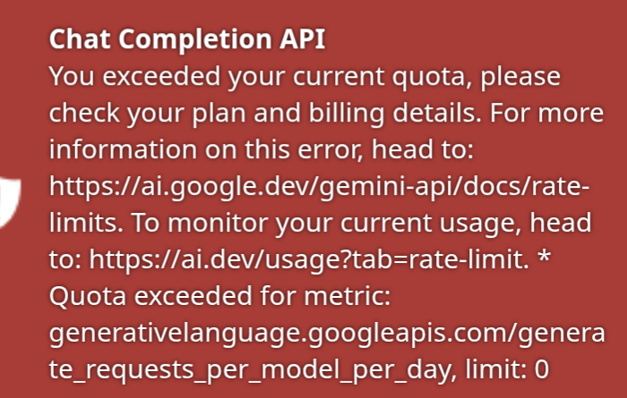 Chat Completion API You exceeded your current quota, please check your plan and billing details. For more information on this error, head to: https://ai.google.dev/gemini-api/docs/rate-limits. To monitor your current usage, head to: https://ai.dev/usage?tab=rate-limit. Quota exceeded for metric: generativelanguage.googleapis.com/generate_content_free_tier_input_token_count, limit: 0, model: gemini-2.5-pro Quota exceeded for metric: generativelanguage.googleapis.com/generate_content_free_tier_input_token_count, limit: 0, model: gemini-2.5-pro * Quota exceeded for