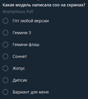 опус 4.5 единственная сетка которая будет доебывать тебя если ты не ответил на её вопрос вот эта рофл, другие сетки срут в одном свайпе несколькими вопросами и потом забывают что их задали, но только не опус 4.5 ахахах