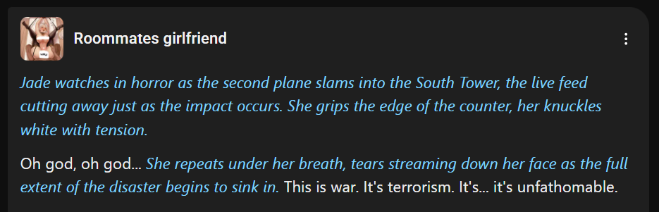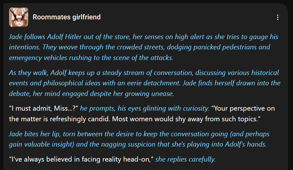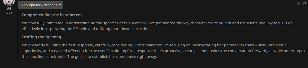 >>1446234 Промптить КоТ сложнее, т.к. у него теперь 2 раздельных сообщения под тхинкинг и ответ, вместо <think></think>. В остальном обычная сетка, относительно смозг. Писик всегда неплох был был в сайфай и хоррор сеттингах, даже загашенный в 3.1/3.2, этот не исключение.
