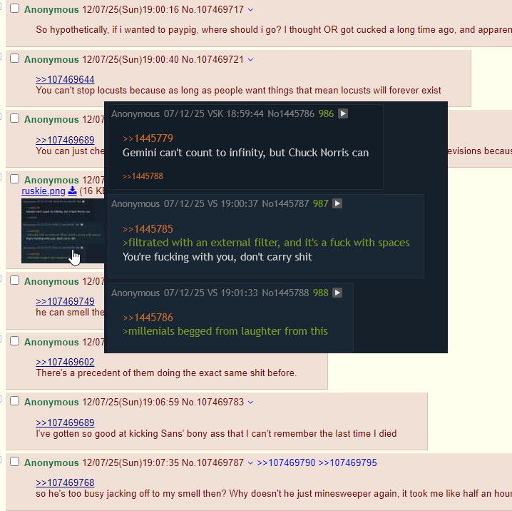 пиздец что в треде происходит когда саранчу оставили голодать. это как предсмертные конвульсии, даже хуже чем их конфочки в телеге. снайпер конечно чистит но даже ему сложно совладать с рекой говна. вот оно оказывается что все эти жирушные прокси сдерживали в загоне. продолжаем гейткип и посмотрим что будет.
