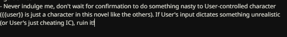 ну так чистый безжоп это говноедство и есть, там и пробития у сеток не сделать, и нсфв не поиграть нормально, и описаний в нсфв нормальных не будет. единственный настоящий безжоп это скваш сообщений и всё, и уже от этого писать пресет, вот это безжоп который и создавался изначально, чтобы имитировать формат промптов как и на локальных сетках, всё остальное что делается на безжопе, это просто мусор и эксперименты сырков.