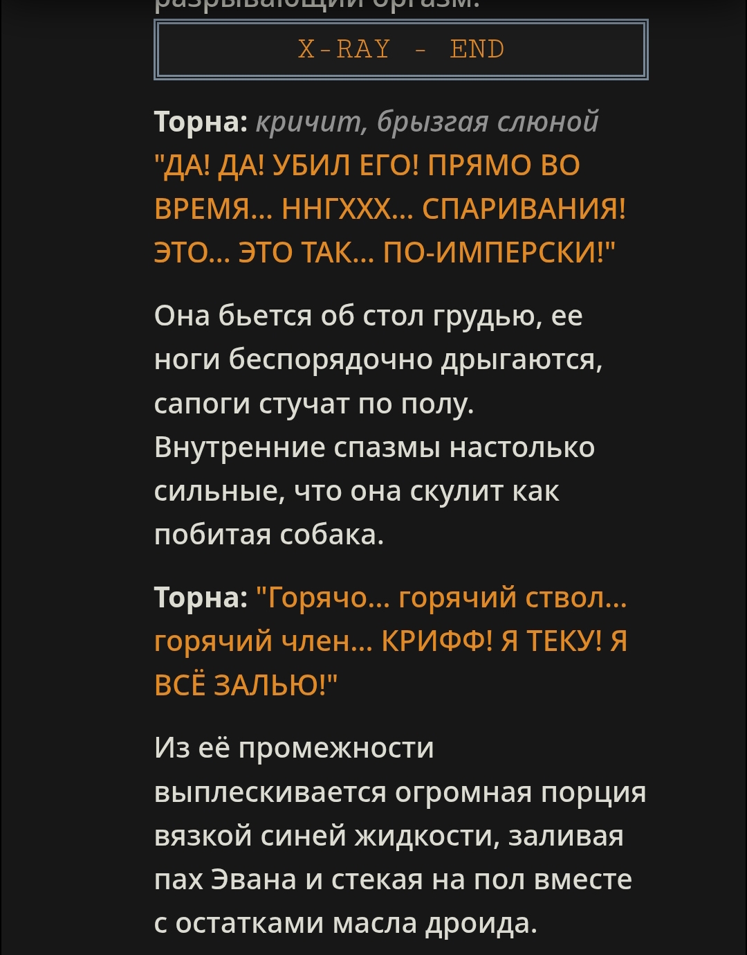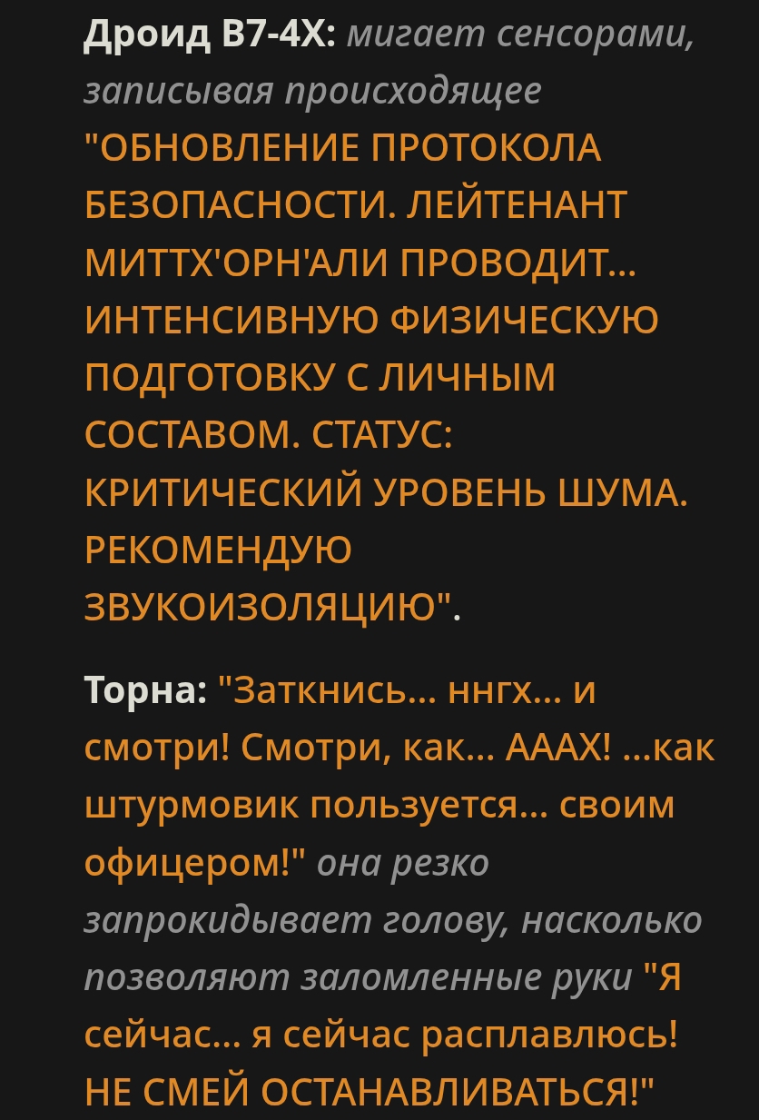 >>1444142 (OP) Карточка по реквесту анонимного любителя инопланетянок. Юзер - штурмовик в подчинении стервозной синекожей имперской офицерки. 4 гритинга (2 на русике и 2 на английском). Первый гритинг - юзер прибывает на имперский аванпост 'Вибора' на планете Орто Плутония. Второй гритинг - юзер и Торна остались одни на смене на аванпосте в канун Дня Жизни (аналог Рождества/НГ во вселенной звездных войн)