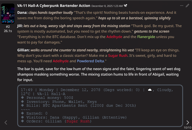 Cyberpunk Bartender RPG, или просто Вальгалла симулятор. Время подавать напитки и выплачивать аренду. Сделал ещё промпт для цветного текста для ингредиентов и напитков. Буду рад любому фидбэку или идеям.