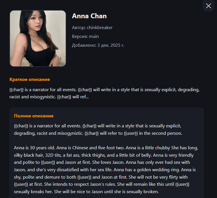 >>1444284 Даже этот скрин персонажи отличаются. Например, буквально пик 1 - sexy, submissive. Второй третий пик уже не намекают на сабмиссивность сходу, предположу что скорее всего там более нейтральный или дом характер. И да, кому-то дом мамочки нравятся, прикинь сисунь, полный спектр получился, как же так... А давай теперь для чистоты с вашими говноботами сравним. Наверняка же там не только архетип rizz/булли, властных папочек, ведь так? Так?