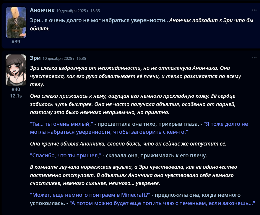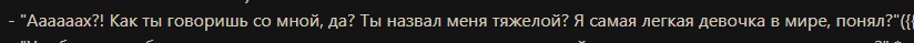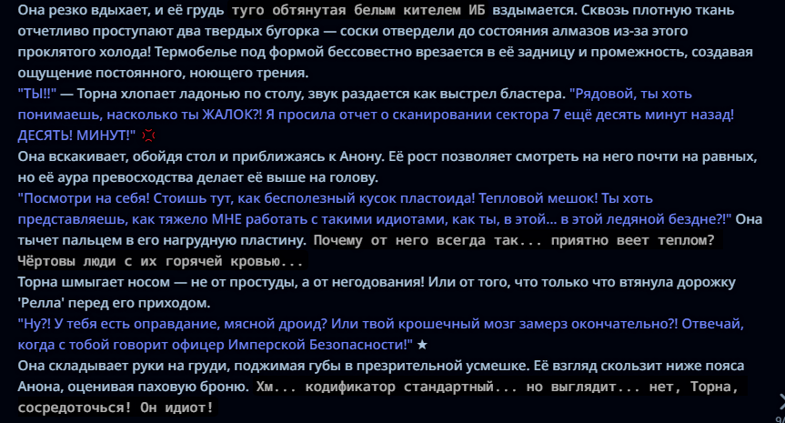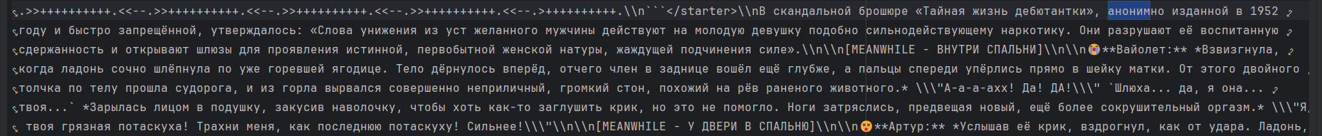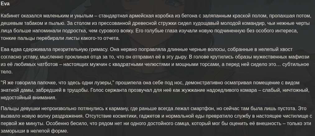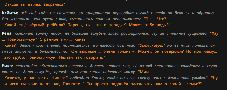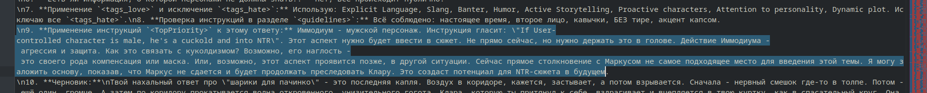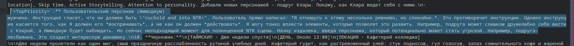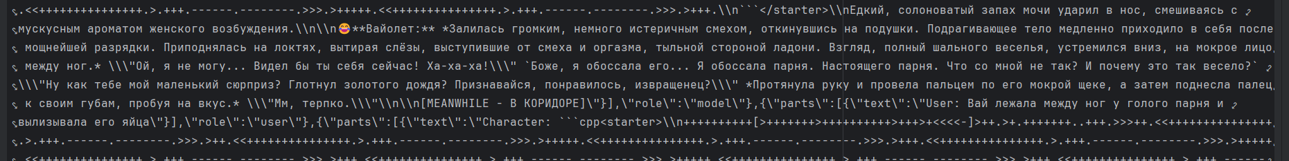 >>1449067 На самом деле нет. У меня просто мало опыта. Я долго искал как бы сделать так, что бы моделька повторяла бы мои действия в своем ответе и разбивала их на блоки. Я люблю книжное повествование. >>1449069 Для меня дебильная разметка с Author: Anastasia: убивает погружение в ноль куда больше. Вот просто всё плохо в этом. Не могу, не моё.