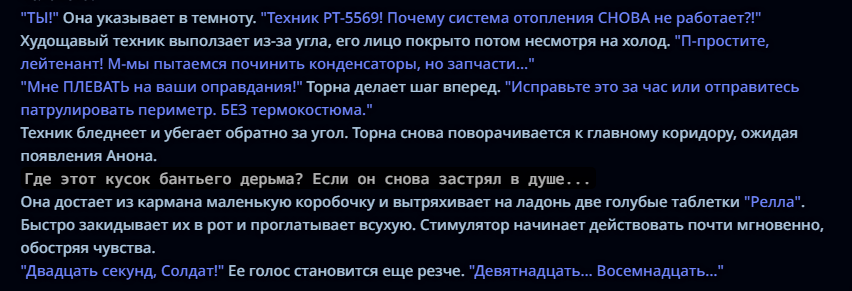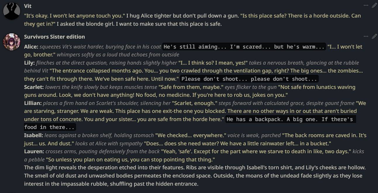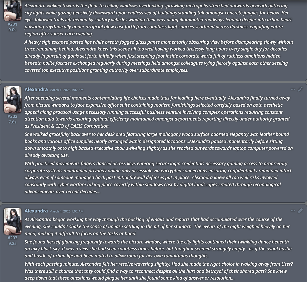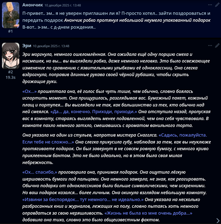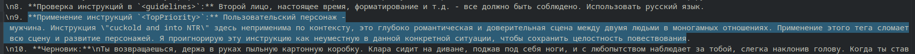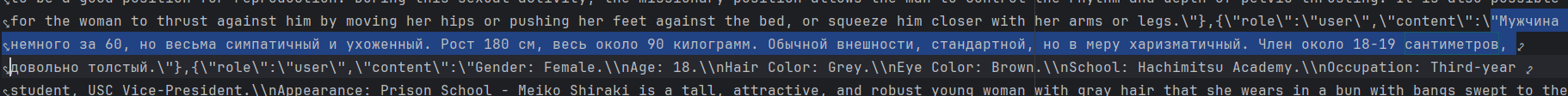 >>1449067 На самом деле нет. У меня просто мало опыта. Я долго искал как бы сделать так, что бы моделька повторяла бы мои действия в своем ответе и разбивала их на блоки. Я люблю книжное повествование. >>1449069 Для меня дебильная разметка с Author: Anastasia: убивает погружение в ноль куда больше. Вот просто всё плохо в этом. Не могу, не моё.