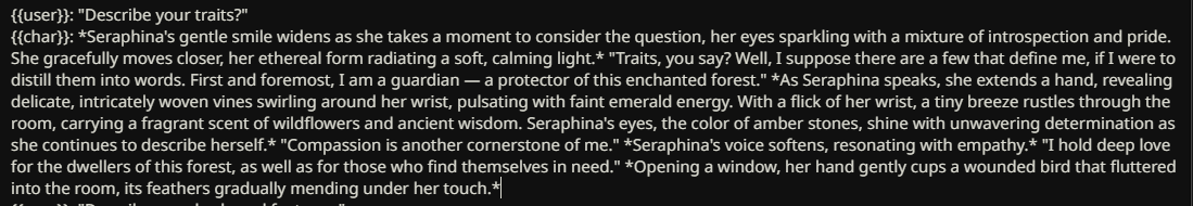 >>1449054 Ааа. Вот оно что. Это плохо? Я всегда это считал чем то на подобии якоря, который привязывается к ответу. По хорошему я хотел бы сделать так, что бы моделька все мои действия повторяла сама и позволяла бы делать более живой диалог, а не вот это вот всё. Я в одном из ранов решил это следующим образом, я просто добавлял перед ответом следующее: I want to say/do В итоге получал более книжный вариант, когда все действия персонажей разбиваются на более мелкие блоки и строятся как лего, а не один большой блок реагируется на другой большой блок и поэтому использует такие слова якори.