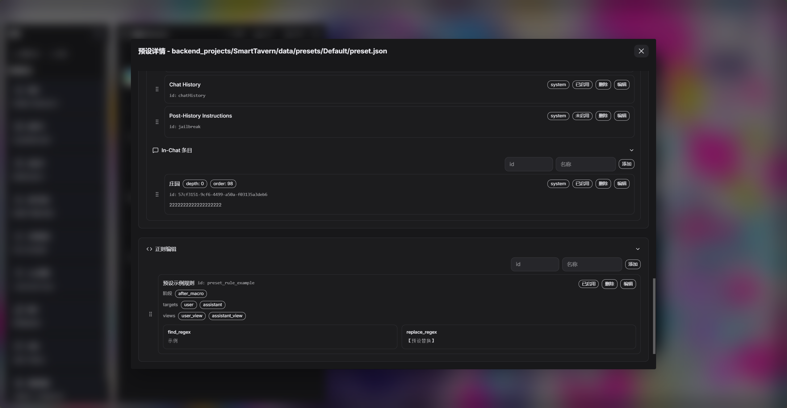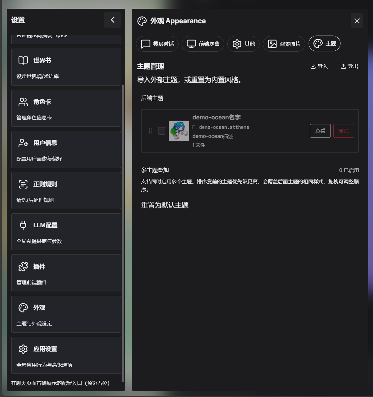 - Clean code, with a separated front end and back end, and modularization. It’s easy to modify, and also easy to feed to an AI and have the AI make changes. - Original Tavern character cards, presets and other files only need a format conversion to continue being used. I developed this while trying to match the Tavern experience. The format converter will continue to be improved. - Extended Tavern’s functionality. For example, presets support embedded regex (when I started the project in late August, Tavern still didn’t support binding regex to presets). Character cards support embedded world books and regex. It also allows you to use some of Tavern’s traditional macros like `{{xx}}`, `<<xx>>`, and supports using Python code to handle complex logic. - Compatible with Tavern’s prompt‑processing logic, while extending what it can do. On the basis of basically matching Tavern’s prompt construction and display logic, I systematically refactored and extended it, adding hook points and plugin features. The extensibility here makes it much easier for plugins to do secondary processing on prompts. - The new front end has built‑in support for displaying HTML code, with optimized rendering logic and performance handling. - Reorganized and simplified how plugins do secondary development on both the front end and the back end. The back end stores which plugins are in use, and the front end also uses front‑end plugins through an API. For example, if you want to add a language type, you only need to add a language‑pack plugin. - Redesigned the APIs. The original Tavern APIs were too bloated and heavy on performance. I’ve now designed a much simpler API format and payload. - Presets, world books, regex files, plugins, etc. can now also be exported as images—images are no longer exclusive to character cards. - There are many other things as well, which I won’t go into here.