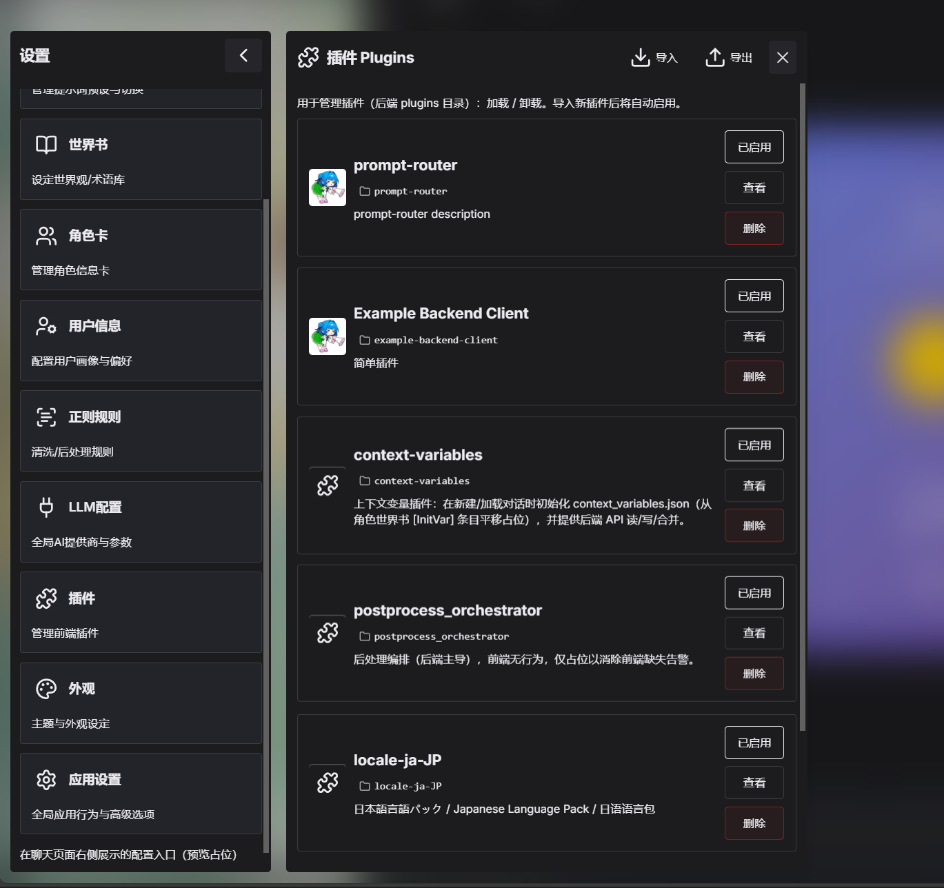 - Back‑end processing of parts of the prompt. When prompts are assembled, I already tag them with their source, so plugins can easily grab prompts from specific sources. The language used is Python. - Making the front end display certain panels: pop‑up messages, standalone panel components for your own features, more advanced styling, animations, etc. The language used is JavaScript. - Combining the two, you can implement basically any functionality. You can create a workflow plugin—for example, automatic summarization, manual summarization, calling MCP, using AI for image generation, and so on.