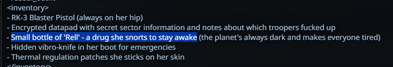В любом случае закидывать сетке всё на похуй это долбоебизм, и тупо хуже работает, даже не столько в контексте дело. Лишнее отвлекалово и сложность только, которые её зафокусят на описанном мирке и не дадут накреативить. Ну не могут сетки за раз столько разнородной инфы переварить, особенно не сгруппированной, а раскиданной кусками по хистори и прочему подобному.