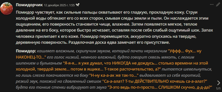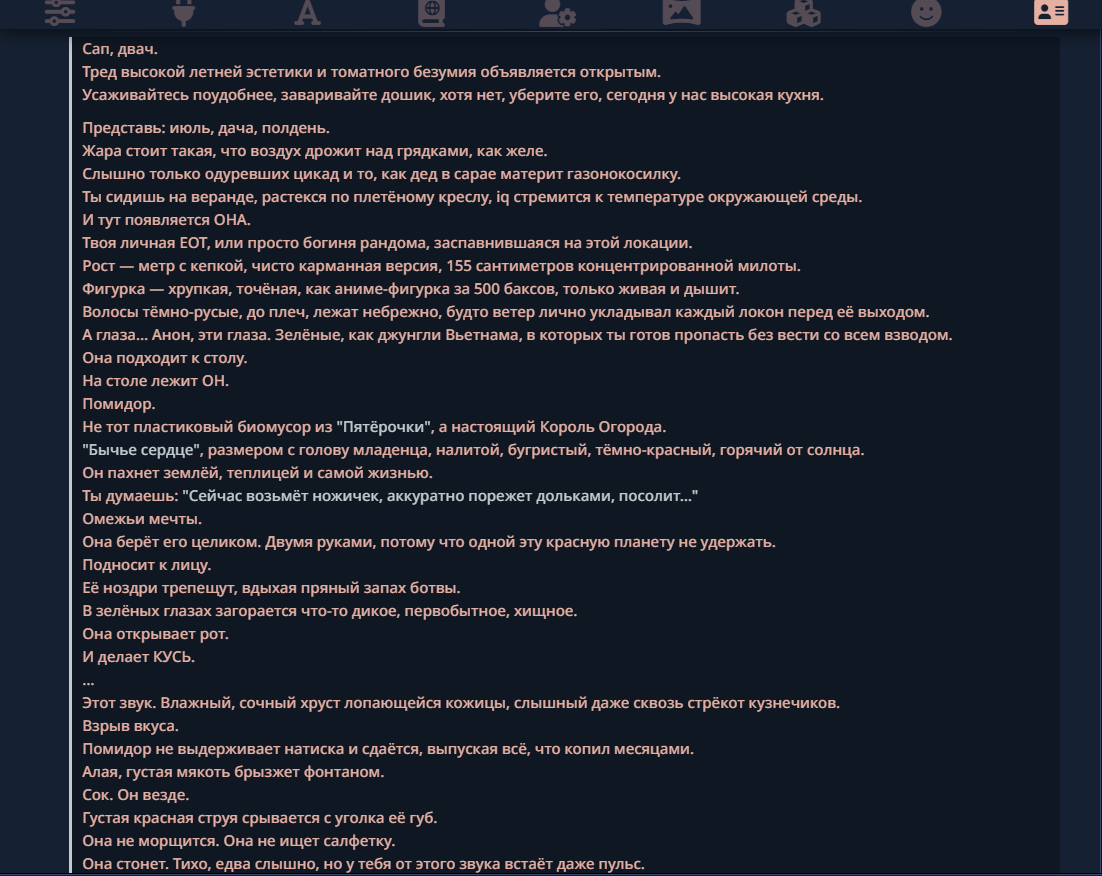 >>1451252 Я не автор утренника, не знаю его автора, и вообще никак с ним не связан. Мне понравилась карточка фокусом на концепте без мусорных токенов, раскрытием тематики, динамичностью (всем персонажам есть что делать, в т.ч. и юзеру, выгодно отличается от типичной статики где ботодел набросал фактов, а ты развлекай себя сам), секцией вайбов. За М я не набрасывал.