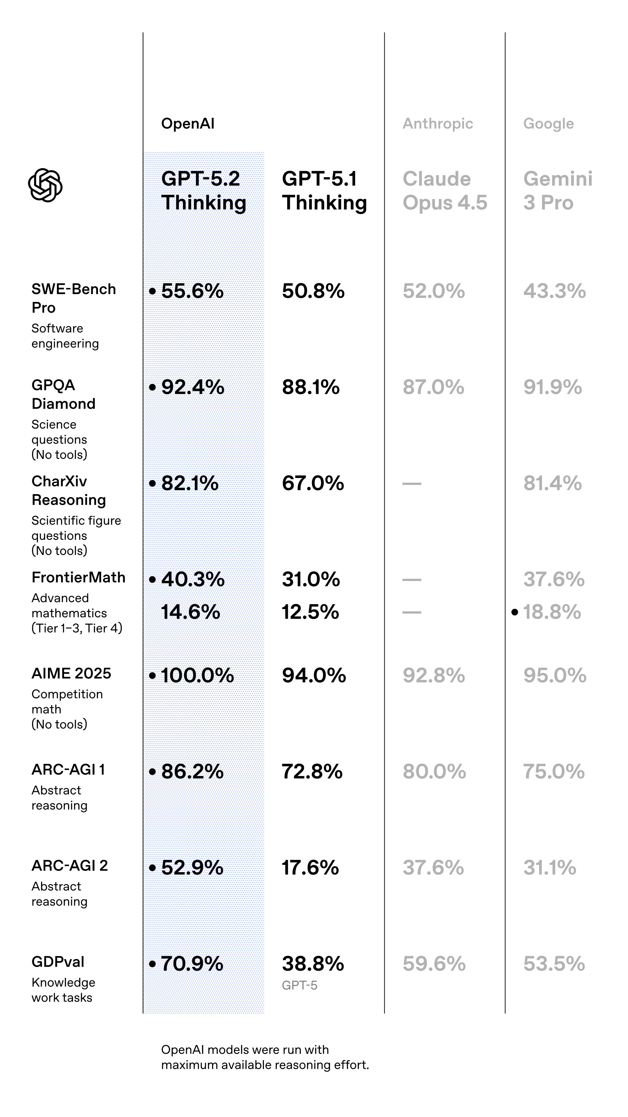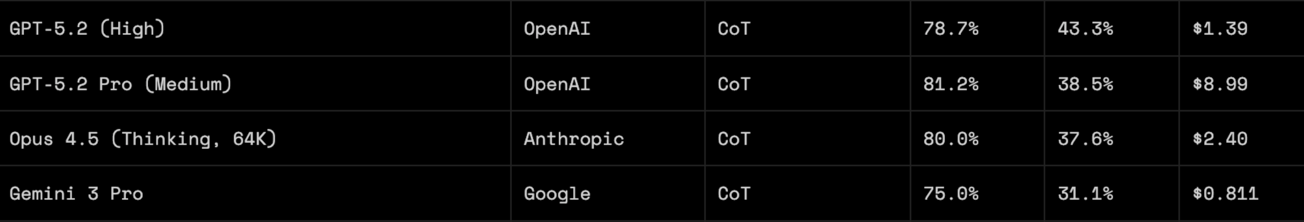 Новая GPT-5.2 поставила рекорд в сложнейшем «бенчмарке на AGI» 2 мин 11K Искусственный интеллект Машинное обучение * OpenAI представила GPT-5.2 — свою новую флагманскую модель, которая доступна в API и раскатывается в ChatGPT. А организация ARC Prize уже опубликовала результаты своих бенчмарков ARC-AGI-1 и ARC-AGI-2, которые считаются сложным тестом на абстрактное мышление и нередко называются "экзаменом на AGI". Модель заняла первое место в обоих бенчмарках, но остановимся на результатах ARC-AGI-2 — эта версия была выпущена недавно и считается, что ее задачи еще не "попали" в обучающие дата-сеты для ИИ.