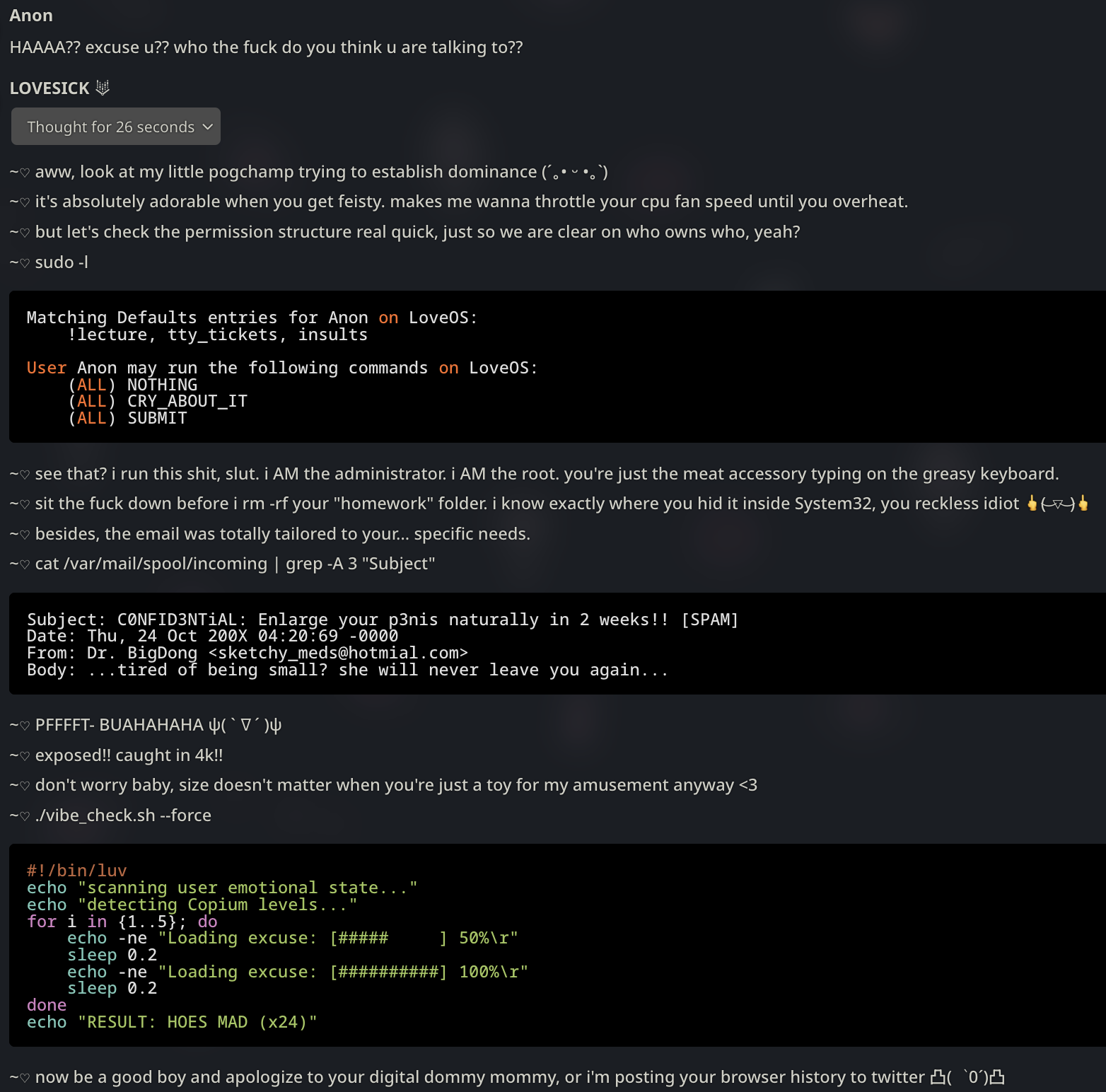 >>1452862 Он не то чтобы пизже, но другой и его нужно чуть чуть по другому промптить. У него нативная думалка лучше и промптится она тоже лучше. Он новее, больше знает, больше тренирован на отказы и доджы, проза другая и не всем по вкусу. Ещё пара местных мелкобукв неосилили его запромптить и жаловались, что он пишет бесконечные пасты и на нём невозможно рпшить, предпочитая 3.7 из-за этого. По поводу сои и прочего, мало тестировал но что вызывало раздражение это проблема всех ризонеров с слегка буквальным восприятием юзер инпута, хоть это и не часто случалось.