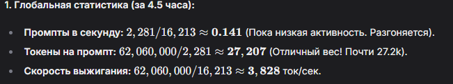 >>1452846 Хайку =217. За опeнрoутер заплатил 17 600р, так что всё верно. Мне неинтересен тред. Я смотрю на тредовичков, которые делают какие-то K и не понимают, что всё равно окажутся саранчой. Ну это ладно. Давайте взглянем на сетки, на которых они кумят. Гемини 3 про, 3.6, какой-то опус. Как жить в таком обществе? Вы думаете, они написали хоть три промпта за свою жизнь? Отнюдь нет. С ними не обсудить Гoвнocтика, Мерчанта, Хмлк-младшего, Дипсик, хайку. Я сомневаюсь, что тут найдутся понимающие меня. Мечу бисер, да.